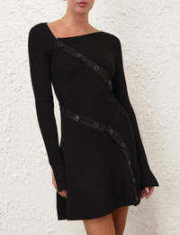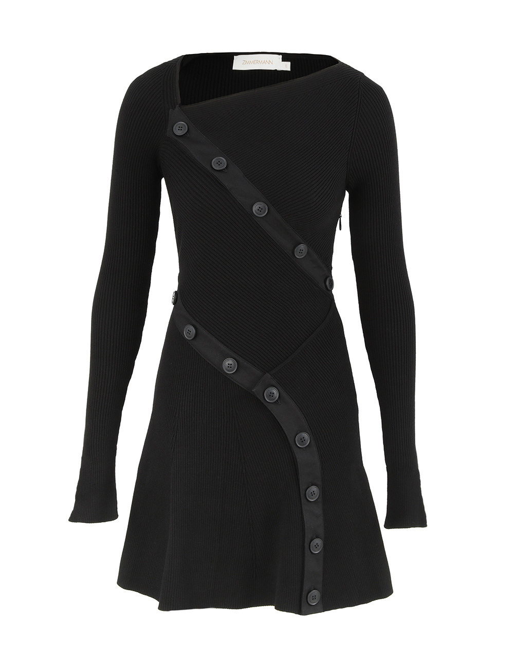 ITEM DETAILS The Rebellion Buttoned Mini Dress in Black from our Cruise 2026 Collection, Twisted Romance. A knit mini dress featuring an asymmetrical neckline, button detailing and a pleated skirt. - Knit mini dress - Long sleeves with split cuffs - Asymmetric neckline and panelling - Ribbed all-over - Frill skirt hem - Decorative buttons Style Code: 6649DC261 SIZE DETAILS 0P 0 1 2 3 4 Length 30.5 32.5 33 33.5 33.5 34 Bust 23.5 25 27.5 30 31.5 31.5 Waist 23.5 25 27.5 30 31.5 31.5 Hip 33 34.5 37 39.5 41 41 Slightly fitted at the bust and waist, loose at the hip When trying on this style, pull it on overhead This garment fits true to size Available in size 0P, suited to clients who are under 5'3"/ 160cm Model is 5'9.5"/178 cm, bust size 32C/10C and wears a size 0 Item measurements are in inches CARE INSTRUCTIONS 72% viscose, 28% polyester Dry clean only code f (hydrocarbon only) Remove any detachable trims prior to dry cleaning Cover to protect trim Iron in low temperature with protective cloth Do not spot clean Store garment flat do not hang Always check the label or care card for specific care instructions.