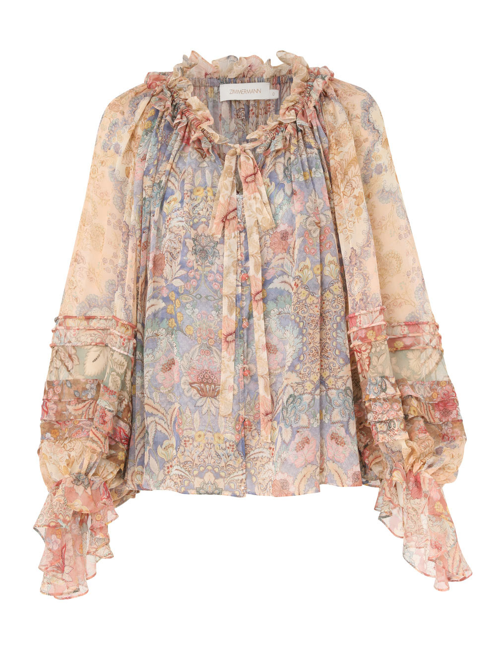 ITEM DETAILS The Rebellion Corded Blouse in Spliced Floral from our Cruise 2026 Collection, Twisted Romance. A silk blouse featuring long blouson sleeves with elasticated cuffs, frill trim on collar and hem, finished with beaded buttons down the centre front. - Silk fabric - Shirred collar with ruffles - Self-tie necktie - High-low hem - Heavily gathered - Comes with a separate cami Style Code: 7237TC261 SIZE DETAILS 0P 0 1 2 3 4 Length 19 21 21 21 21.5 21.5 Bust 38.5 41 42.5 45 46.5 49 Sleeve 30 31.5 32 32.5 32.5 33 Designed for a relaxed fit Light-weight, non-stretchy fabric This garment fits true to size Available in size 0P, suited to clients who are under 5'3"/ 160cm Model is 5'9.5"/178 cm, bust size 32C/10C and wears a size 0 Item measurements are in inches CARE INSTRUCTIONS Main: 100% silk; slip: 86% recycled polyester, 14% elastane Dry clean only code f (hydrocarbon only); Remove any detachable trims prior to dry cleaning; Cover to protect trim; Iron in low temperature with protective cloth; Light steam only; Do not spot clean Gentle cold hand wash separately with mild detergent; Do not bleach; Dry in shade; Iron in low temperature with protective cloth; Do not tumble dry; Dry cleanable code f (hydrocarbon only); Always check the label or care card for specific care instructions.