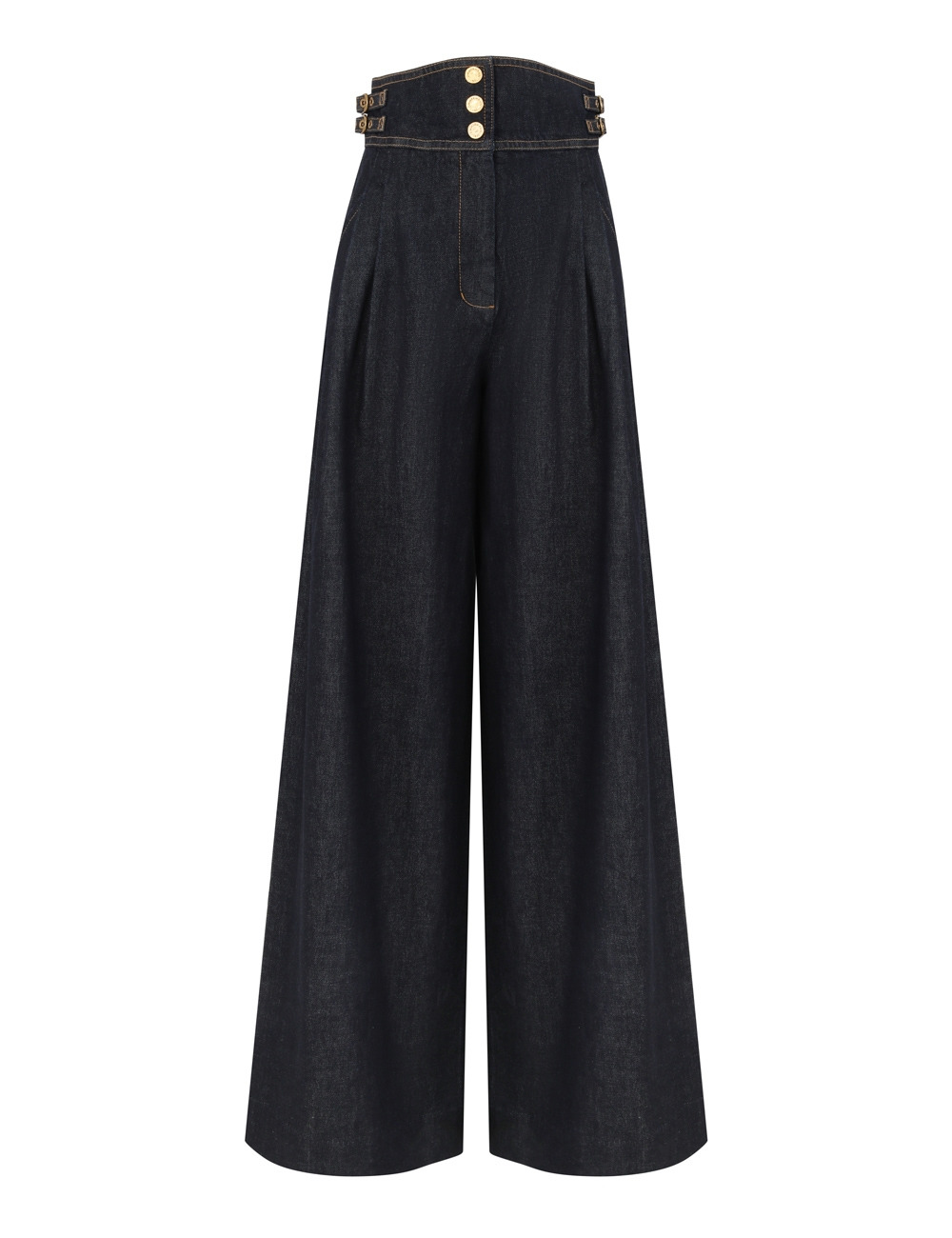 ITEM DETAILS The Rebellion Denim Tailored Pant in Night Sky from our Cruise 2026 Collection, Twisted Romance. A denim high-waisted pant featuring gold buttons down the centre front, topstitching throughout and side pockets, finished with a flared hem. - Denim wide leg pant - High-rise waist with buckle tabs - Centre front fly closure with gold buttons - Pintucks through centre front legs Style Code: 6392PC261 SIZE DETAILS 24 25 26 27 28 29 30 31 32 Length 48 48 48.5 48.5 48.5 49 Waist 25 27 27.5 28.5 30 30.5 Hip 44 45 45.5 46.5 48 49 Inseam 35 35 35 35 35 35 Designed to be fitted at the waist, relaxed through the legs High-rise waist with a full-length leg This garment fits true to size Model is 5'9.5"/178 cm, bust size 32C/10C and wears a size 26 Item measurements are in inches CARE INSTRUCTIONS Main: 75% cotton, 25% viscose; pocketing: 65% polyester, 35% cotton Gentle cold machine wash separately with mild detergent; Remove any detachable trims prior to cleaning Cover to protect trim; Do not soak or bleach; Do not tumble dry; Dry in shade without delay; Iron in low temperature with protective cloth; Do not spot clean; Dry cleanable code p Always check the label or care card for specific care instructions.