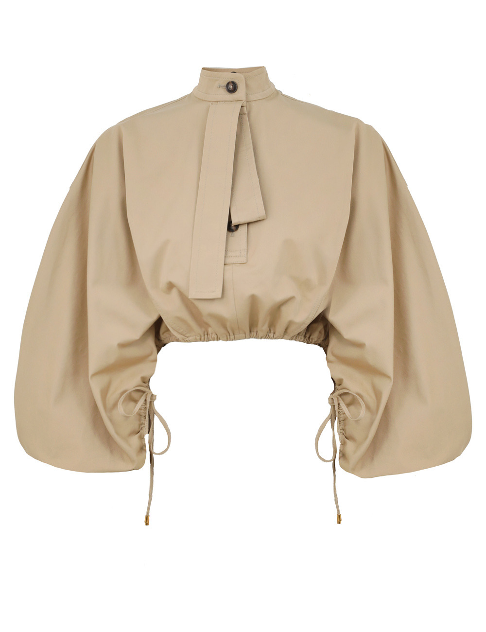 ITEM DETAILS The Rebellion Drawn Top in Beige from our Cruise 2026 Collection, Twisted Romance. A cotton cropped shirt featuring a stand collar, detachable necktie, partial button closure at centre front, finished with a drawstring waist cord with rouleau ties. - 100% cotton fabric - Cropped style shirt - Long blouson sleeves - Elasticated cuffs and waist - Functional buttons down centre front - Heavily gathered - Top stitching throughout Style Code: 6916TC261 SIZE DETAILS 0P 0 1 2 3 4 Length 38.5 17.5 17.5 17.5 17.5 17.5 Waist 26 27.5 29 31.5 33 35.5 Hip 38.5 41 43.5 45 47 49.5 Designed for a slightly oversized, cropped fit This garment fits true to size Available in size 0P, suited to clients who are under 5'3"/ 160cm Model is 5'9.5"/178 cm, bust size 32C/10C and wears a size 0 Item measurements are in inches CARE INSTRUCTIONS Main: 100% cotton; yoke lining: 100% cotton Dry clean only code f (hydrocarbon only); Remove any detachable trims prior to dry cleaning; Cover to protect trim; Iron in low temperature with protective cloth; Light steam only; Do not spot clean Always check the label or care card for specific care instructions.