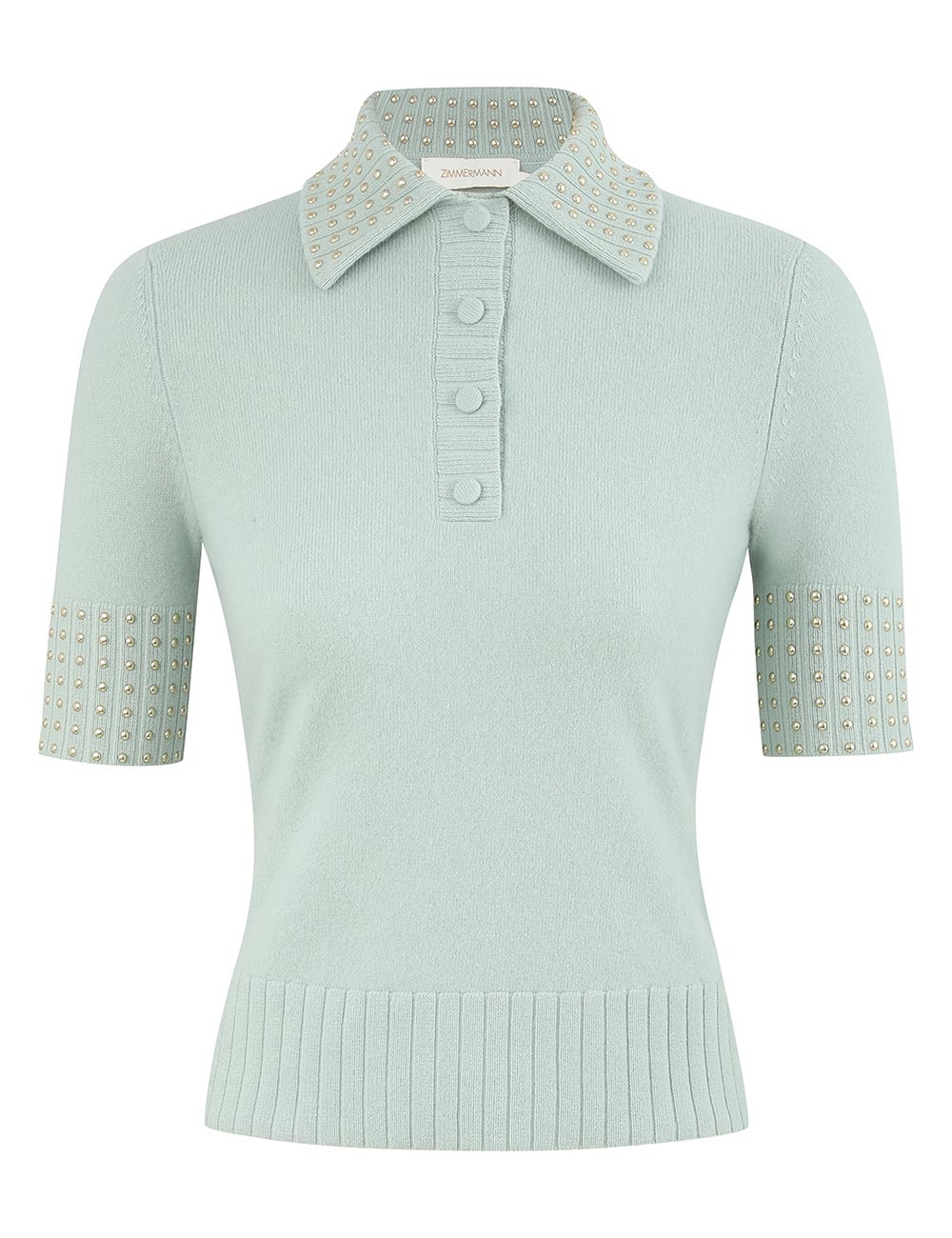 ITEM DETAILS The Rebellion Embellished Polo in Mint from our Cruise 2026 Collection, Twisted Romance. A merino wool knit top featuring a classic collar and gold-studded embellishments to the collar and sleeve cuffs. - Slim fit knit polo - Classic collar - Short sleeves - Gold stud embellishments on collar and sleeves - Partial button closure at centre front - Ribbed hem Style Code: 6970TC261 SIZE DETAILS 0P 0 1 2 3 4 Length 19.5 21 21.5 21.5 21.5 22 Bust 29 30.5 33 35.5 37 39.5 Waist 26 27.5 30 32.5 34 36 Sleeve 10 10.5 11 11 11.5 11.5 Designed for a close fit This garment fits true to size Available in size 0P, suited to clients who are under 5'3"/ 160cm Model is 5'9.5"/178 cm, bust size 32C/10C and wears a size 0 Item measurements are in inches CARE INSTRUCTIONS 100% merino wool Dry clean only code f (hydrocarbon only) Remove any detachable trims prior to dry cleaning Cover to protect trim Iron in low temperature with protective cloth Do not spot clean Store garment flat do not hang Always check the label or care card for specific care instructions.