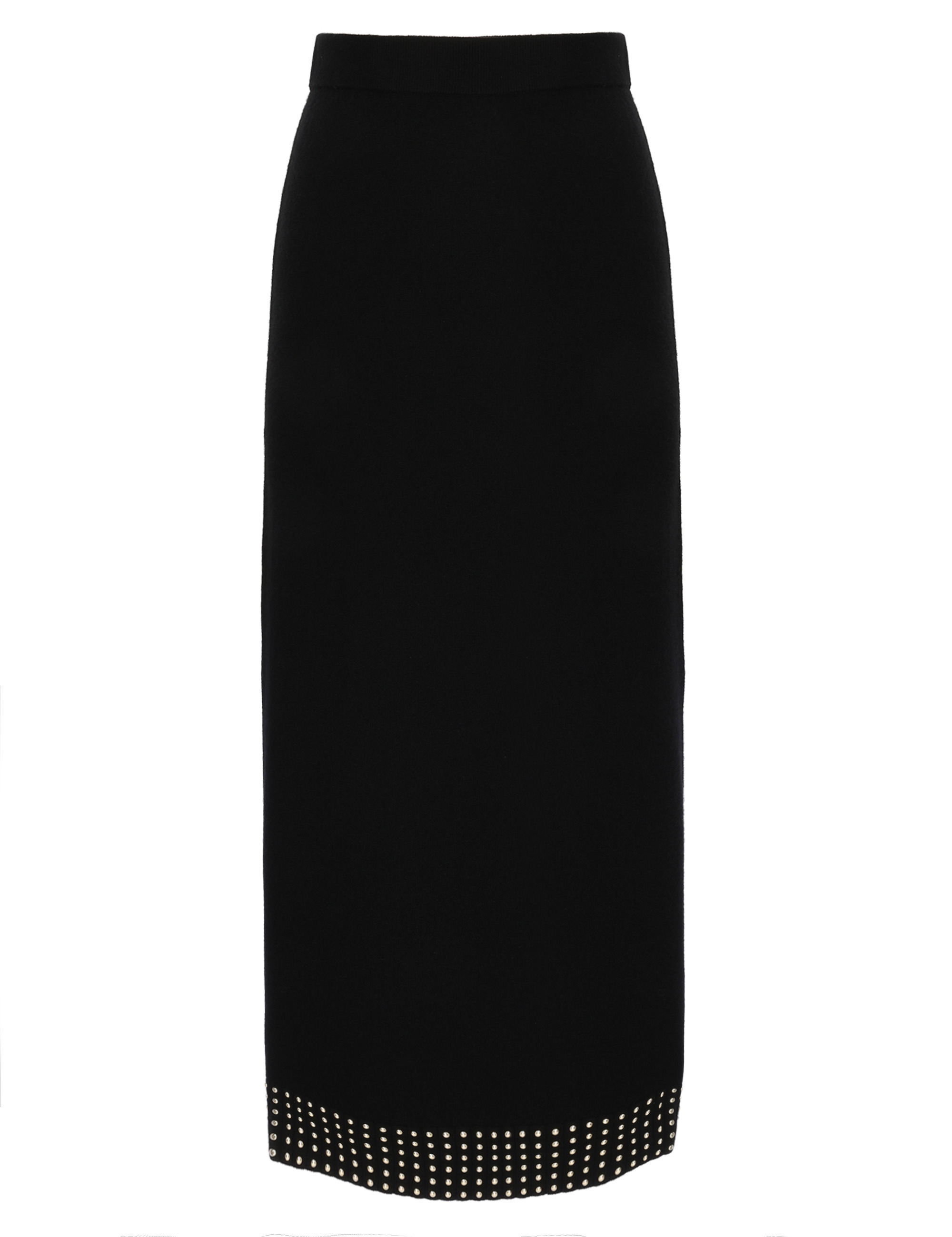 ITEM DETAILS The Rebellion Embellished Skirt in Black from our Cruise 2026 Collection, Twisted Romance. A merino wool midi-length skirt featuring a ribbed, elasticated waistband and gold-studded embellishments along the hem. - Wool-cashmere blend - Mid-rise fit - Ribbed, elasticated waistband - Gold stud embellishments on ribbed hem - Slip on style Style Code: 7226SC261 SIZE DETAILS 0P 0 1 2 3 4 Length 30.5 34 34 34 34 34 Waist 23.5 25 27 29 30.5 33 Hip 30.5 32.5 34.5 37 38.5 41 Designed with an elasticated waist for a flexible fit This garment fits true to size Available in size 0P, suited to clients who are under 5'3"/ 160cm Model is 5'9.5"/178 cm, bust size 32C/10C and wears a size 0 Item measurements are in inches CARE INSTRUCTIONS 90% merino wool, 10% cashmere Dry clean only code f (hydrocarbon only) Remove any detachable trims prior to dry cleaning Cover to protect trim Iron in low temperature with protective cloth Do not spot clean Store garment flat do not hang Always check the label or care card for specific care instructions.