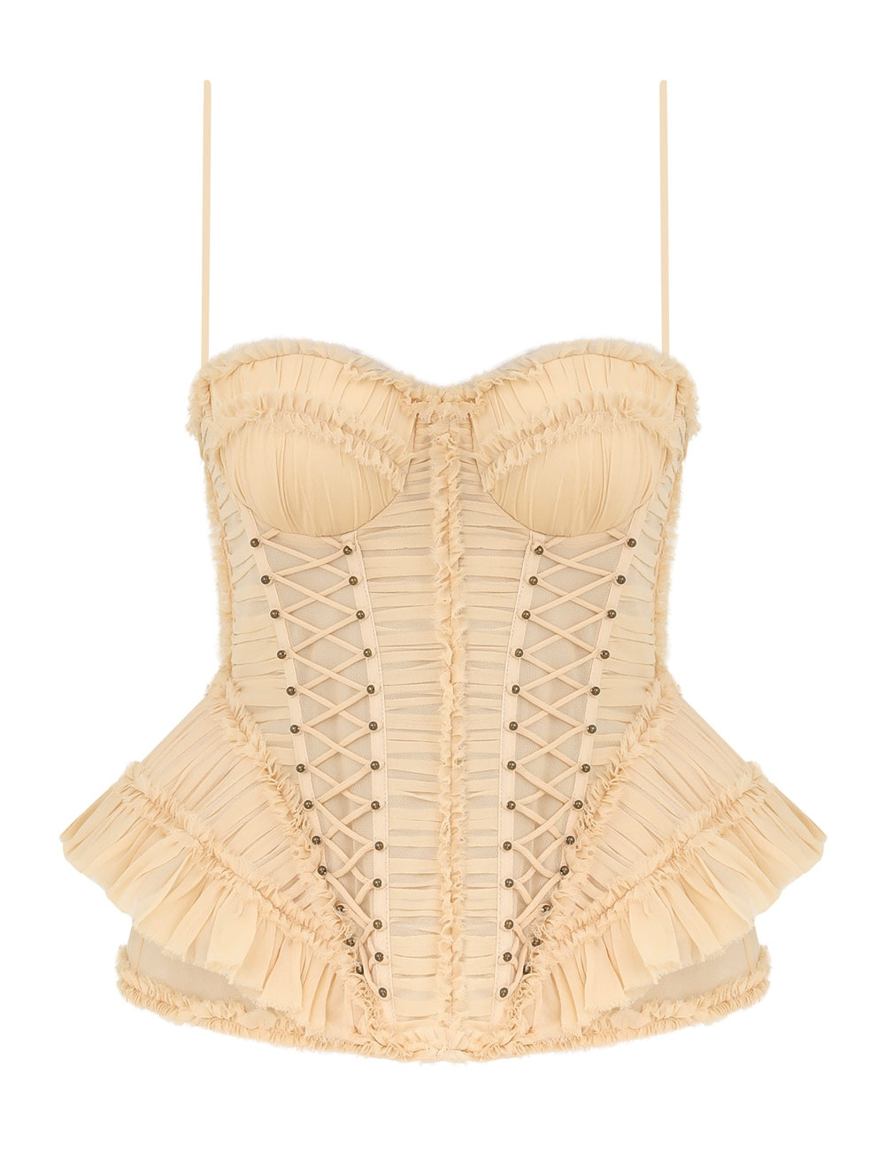ITEM DETAILS The Rebellion Frayed Corset in Cream from our Cruise 2026 Collection, Twisted Romance. A silk corset featuring rouleau straps and lace-up panels, finished with frayed trim and an invisible centre back closure. - Silk fabric - Structured bodice with internal boning - Bust with underwire - Peplum detailing at high hip - Removeable, adjustable straps - Ruching throughout - Gold dome buttons anchoring rouleau lacing Style Code: 7020TC261 SIZE DETAILS 0P 0 1 2 3 4 Length 11.5 12.5 12.5 12.5 12.5 12.5 Bust 26 28.5 30 32.5 34 36 Waist 25 26 28.5 30 32.5 34 Designed to be fitted on the body Due to the boning structure, the bodice may feel restrictive This garment fits true to size Available in size 0P, suited to clients who are under 5'3"/ 160cm Model is 5'9.5"/178 cm, bust size 32C/10C and wears a size 0 Item measurements are in inches CARE INSTRUCTIONS Main: 100% silk; contrast: 100% polyester; lining: 100% silk; crinoline: 100% polyester Dry clean only code f (hydrocarbon only); Remove any detachable trims prior to dry cleaning; Cover to protect trim; Iron in low temperature with protective cloth; Light steam only; Do not spot clean Always check the label or care card for specific care instructions.