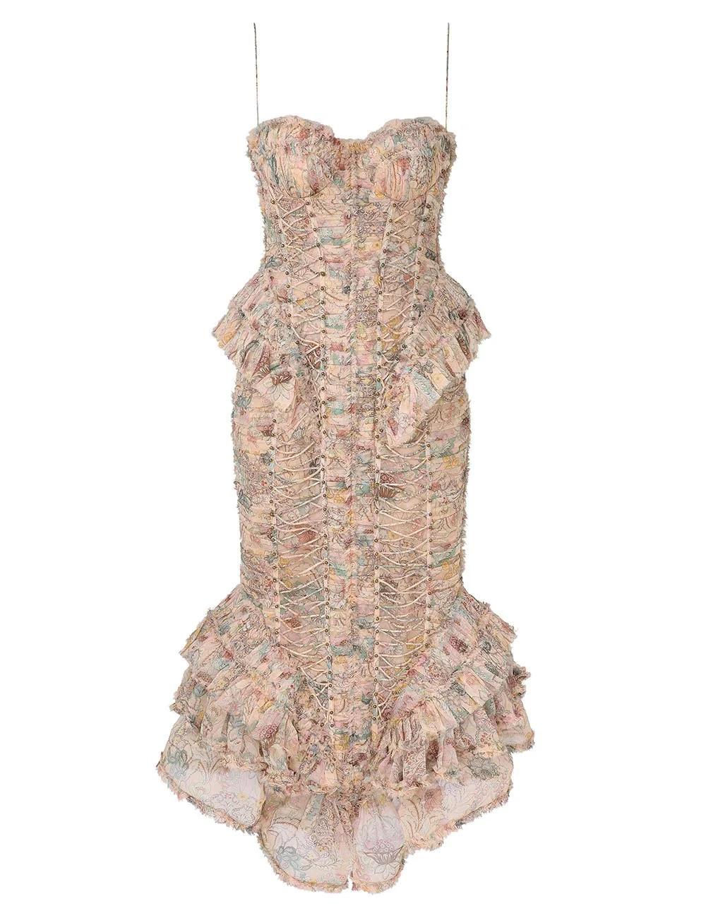 ITEM DETAILS The Rebellion Frayed Midi Dress in Pink Floral from our Cruise 2026 Collection, Twisted Romance. A silk mermaid-style dress featuring a sweetheart neckline, self-tie shoulder straps, cascading ruffles, and an invisible zip closure. - Silk fabric - Underwire at bust - Lace-up panels throughout - Frayed trim at frill edges - Gold dome buttons anchoring rouleau lacing - Invisible zip closure at centre back Style Code: 6494DC261 SIZE DETAILS 0P 0 1 2 3 4 Length 35.5 42 42 42 42 42 Bust 26 28.5 30 32.5 34 36 Waist 25 26 28.5 30 32.5 34 Hip 35.5 38 40 41.5 44 45.5 Designed to be fitted on the body Due to the boning structure, the bodice may feel restrictive Light-weight, non-stretchy fabric This garment fits true to size Available in size 0P, suited to clients who are under 5'3"/ 160cm Model is 5'9.5"/178 cm, bust size 32C/10C and wears a size 0 Item measurements are in inches CARE INSTRUCTIONS Main: 100% silk; contrast: 100% polyester; lining: 100% silk; crinoline: 100% polyester Dry clean only code f (hydrocarbon only); Remove any detachable trims prior to dry cleaning; Cover to protect trim; Iron in low temperature with protective cloth; Light steam only; Do not spot clean Always check the label or care card for specific care instructions.