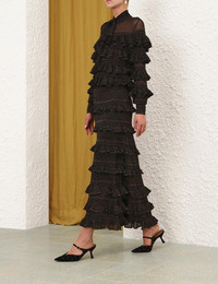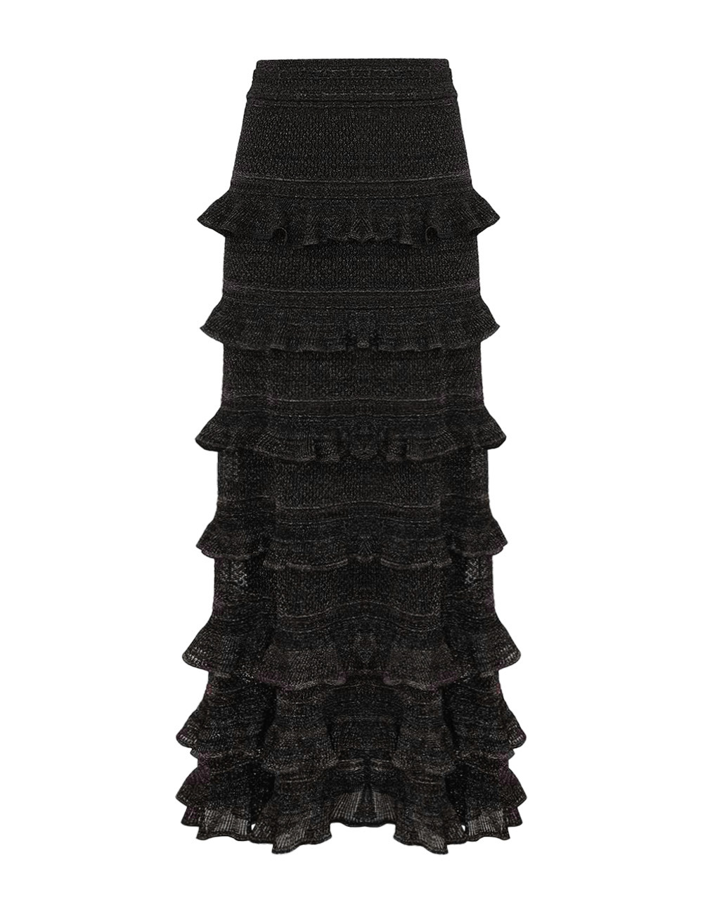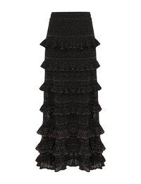ITEM DETAILS The Rebellion Frill Midi Skirt in Metallic Black from our Cruise 2026 Collection, Twisted Romance. A knit midi skirt featuring an elasticated waistband and tiered ruffle details throughout. - High-waisted, midi skirt - Cascading frills throughout - Ribbed panelling - Contrasting trim - Slim fit - Slip on style Style Code: 7314SC261 SIZE DETAILS 0P 0 1 2 3 4 Length 28 31 31 31 31 31 Waist 23 23.5 26 28.5 30 32.5 Hip 30.5 32.5 34.5 37 38.5 41 Designed with an elasticated waist for a flexible fit This garment fits true to size Available in size 0P, suited to clients who are under 5'3"/ 160cm Model is 5'9.5"/178 cm, bust size 32C/10C and wears a size 0 Item measurements are in inches CARE INSTRUCTIONS Main: 56% viscose 32% polyester 13% metallised fibre Lining: 100% viscose Dry clean only code f (hydrocarbon only) Remove any detachable trims prior to dry cleaning Cover to protect trim Iron in low temperature with protective cloth Do not spot clean Store garment flat do not hang Always check the label or care card for specific care instructions.