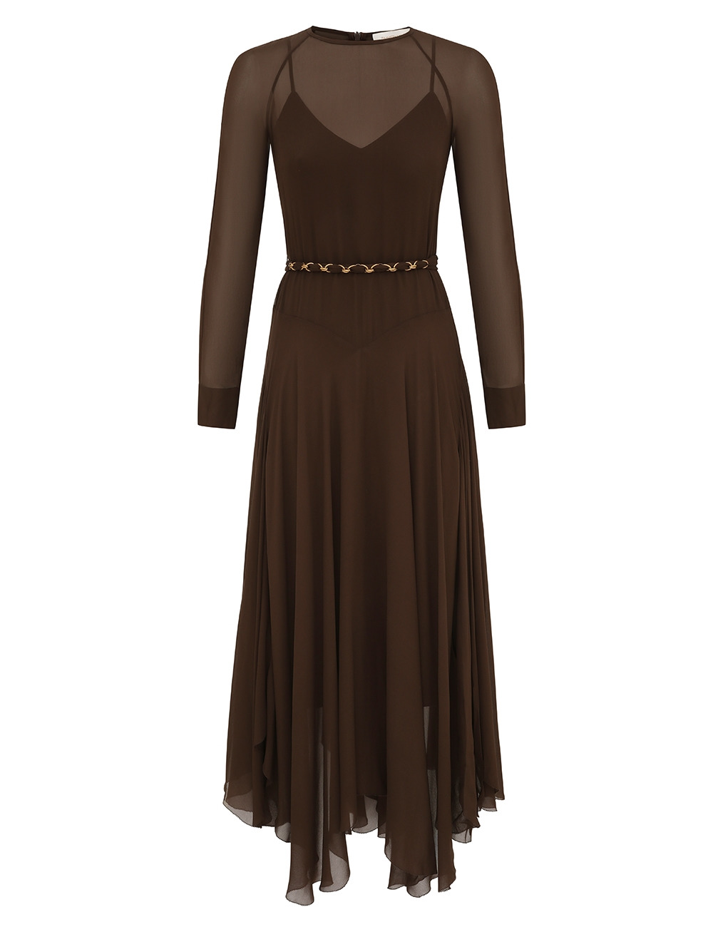 ITEM DETAILS The Rebellion Handkerchief Dress in Truffle from our Cruise 2026 Collection, Twisted Romance. A midi-length dress featuring a crew neckline, long fitted sleeves, removable waist belt and a pleated skirt. - Midi-length dress - Long sheer sleeves - Invisible zip closure at centre back - Cascading pleat skirt - Asymmetrical hem - Removable chain belt - Comes with a separate slip Style Code: 7128DC261 SIZE DETAILS 0P 0 1 2 3 4 Length 32.5 25 25 25 25 25.5 Bust 33 35.5 37 39.5 41 43.5 Waist 31.5 33 34.5 37 39.5 41 Hip 32.5 34.5 37 38.5 41 42.5 Designed to be fitted at the bust and sleeves, loose at the hip This garment fits true to size Available in size 0P, suited to clients who are under 5'3"/ 160cm Model is 5'9.5"/178 cm, bust size 32C/10C and wears a size 0 Item measurements are in inches CARE INSTRUCTIONS Main: 100% viscose; slip: 100% viscose Dry clean only code f (hydrocarbon only); Remove any detachable trims prior to dry cleaning; Cover to protect trim; Iron in low temperature with protective cloth; Light steam only; Do not spot clean Gentle cold hand wash separately with mild detergent; Do not bleach; Dry in shade; Iron in low temperature with protective cloth; Do not tumble dry; Dry cleanable code f (hydrocarbon only); Always check the label or care card for specific care instructions.