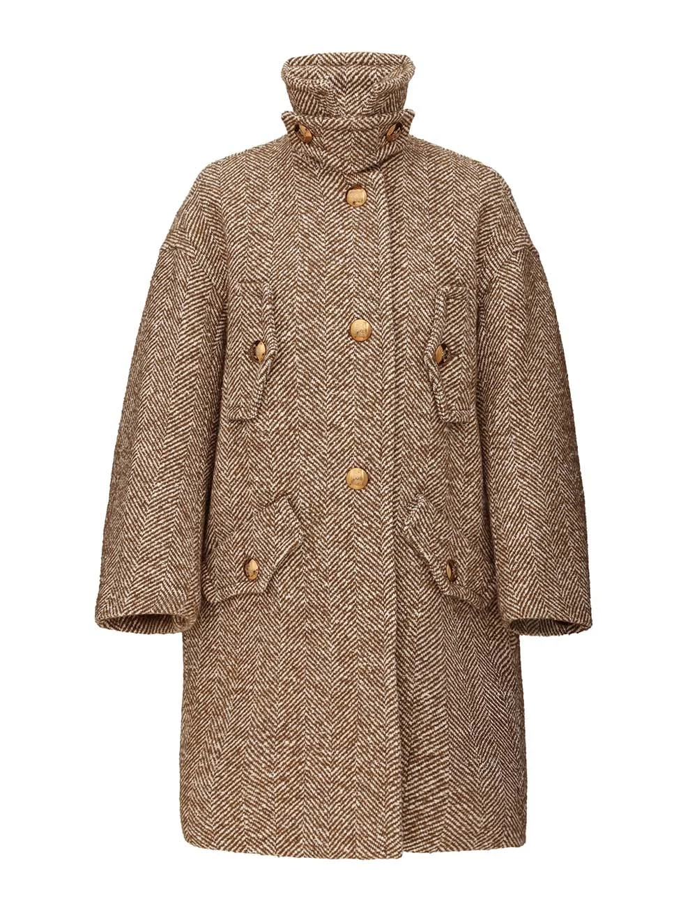 ITEM DETAILS The Rebellion Herringbone Coat in Cream/Tan from our Cruise 2026 Collection, Twisted Romance. A single breasted coat featuring a high stand collar, button closure at the centre front, and front flap pockets. - Oversize stand collar with detachable neck flap - Button closure at front - Front flap pockets Style Code: 6850CC261 SIZE DETAILS XS S M L Length 35.5 38 38 38.5 Bust 48 50.5 54.5 58.5 Hip 49 50.5 54.5 58.5 Sleeve 30.5 32.5 33.5 34.5 Oversized style Heavy-weight fabric This garment fits true to size Available in size 0P, suited to clients who are under 5'3"/ 160cm Model is 5'9.5"/178 cm, bust size 32C/10C and wears a size 0 Item measurements are in inches CARE INSTRUCTIONS Main: 33% acrylic, 30% wool, 25% polyester, 7% cotton, 5% silk; lining: 75% viscose, 25% silk Dry clean only code f (hydrocarbon only); Remove any detachable trims prior to dry cleaning; Cover to protect trim; Do not steam; Iron in low temperature with protective cloth; Do not spot clean Always check the label or care card for specific care instructions.