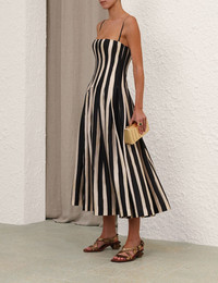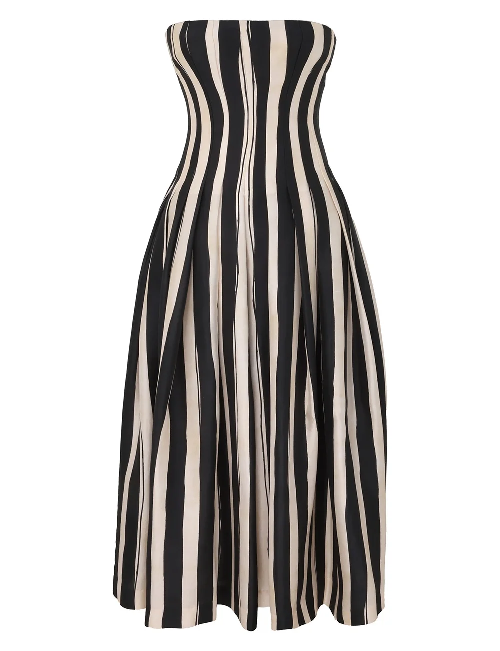 ITEM DETAILS The Rebellion Paint Stripe Gown in Black Stripe from our Cruise 2026 Collection, Twisted Romance. A silk midi dress featuring a fitted bodice, invisible zip closure at centre back and a voluminous skirt. - Silk fabric - Detachable, adjustable straps - Corset bodice with boning - Pleated skirt - Side seam pockets - Lined Style Code: 6509DC261 SIZE DETAILS 0P 0 1 2 3 4 Length 39.5 43 43 43 43 43 Bust 30 32.5 34 36 38 40 Waist 25 27 28.5 30.5 32.5 34.5 Hip 32.5 34.5 37 38.5 41 42.5 Fitted at the bust and waist, loose at the hip Mid-weight, non-stretchy fabric Due to the boning structure, the bodice may feel restrictive This garment fits true to size Available in size 0P, suited to clients who are under 5'3"/ 160cm Model is 5'9.5"/178 cm, bust size 32C/10C and wears a size 0 Item measurements are in inches CARE INSTRUCTIONS Main: 100% silk; Dry clean only code f (hydrocarbon only); Remove any detachable trims prior to dry cleaning; Cover to protect trim; Iron in low temperature with protective cloth; Light steam only; Do not spot clean Always check the label or care card for specific care instructions.