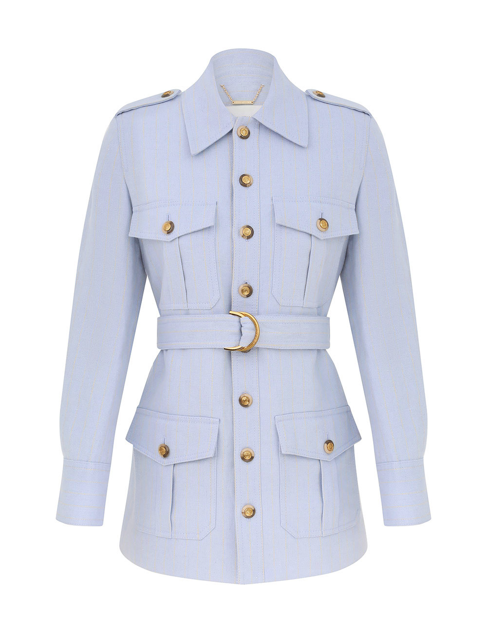 ITEM DETAILS The Rebellion Pinstripe Jacket in Sky Stripe from our Cruise 2026 Collection, Twisted Romance. A linen jacket featuring a classic collar, gold buttons down the centre front and a removable waist belt. - Linen fabric - Self covered removable belt - Functional gold buttons down centre front - Flap pockets at chest and hips - Shoulder tabs - Buttoned cuffs - Fully lined Style Code: 6989JC261 SIZE DETAILS 0P 0 1 2 3 4 Length 27 29 29.5 30 30 30.5 Bust 36 38.5 40 42.5 44 46.5 Waist 37 38.5 41 42.5 45 46.5 Sleeve 22.5 24 24.5 25 25 25 Tailored fit Mid-weight, non-stretchy fabric This garment fits true to size Available in size 0P, suited to clients who are under 5'3"/ 160cm Model is 5'9.5"/178 cm, bust size 32C/10C and wears a size 0 Item measurements are in inches CARE INSTRUCTIONS Main: 100% linen; lining: 75% viscose, 25% silk Dry clean only code f (hydrocarbon only); Remove any detachable trims prior to dry cleaning; Cover to protect trim; Iron in low temperature with protective cloth; Light steam only; Do not spot clean Always check the label or care card for specific care instructions.