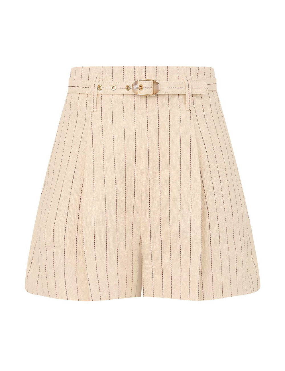 ITEM DETAILS The Rebellion Pinstripe Short in Cream Stripe from our Cruise 2026 Collection, Twisted Romance. A linen short featuring a fixed waistband, invisible centre back zip closure, welt pockets and a removable waist belt. - Linen fabric - High waisted short - Removable belt with hardware - Back welt pockets - Centre front pleats - Invisible zip closure at centre back - Fully lined Style Code: 2103AC261 SIZE DETAILS 0P 0 1 2 3 4 Length 37 15.5 16 16.5 16.5 17 Waist 25 27 28.5 30.5 32.5 34.5 Hip 37 38.5 41 43.5 45 47 Inseam 3 3 3 3 3 3 Designed to be fitted at the waist, relaxed throughout the legs Mid-weight, non-stretchy fabric This garment fits true to size Available in size 0P, suited to clients who are under 5'3"/ 160cm Model is 5'9.5"/178 cm, bust size 32C/10C and wears a size 0 Item measurements are in inches CARE INSTRUCTIONS Main: 100% linen; lining: 75% viscose, 25% silk Dry clean only code f (hydrocarbon only); Remove any detachable trims prior to dry cleaning; Cover to protect trim; Iron in low temperature with protective cloth; Light steam only; Do not spot clean Always check the label or care card for specific care instructions.
