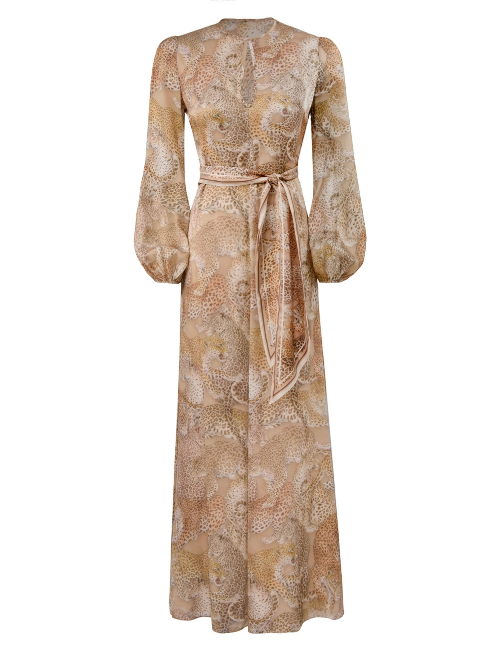 ITEM DETAILS The Rebellion Sheath Dress in Latte Leopard from our Cruise 2026 Collection, Twisted Romance. A silk maxi dress featuring a crew neckline, keyhole detailing at the bust and long billow sleeves with elasticated cuffs. - Silk fabric - Full-length gown - Removable silk scarf belt - Invisible zip closure at centre back - Long sleeves with elasticated cuffs Style Code: 7103DC261 SIZE DETAILS 0P 0 1 2 3 4 Length 54.5 59 59.5 59.5 60 60 Bust 33 35.5 37 39.5 41.5 43.5 Waist 27.5 29 30.5 33 34.5 37 Sleeve 25 27 27 27 27 27.5 Slightly fitted at the bust and waist, loose at the hip Light-weight, non-stretchy fabric This garment fits true to size Available in size 0P, suited to clients who are under 5'3"/ 160cm Model is 5'9.5"/178 cm, bust size 32C/10C and wears a size 0 Item measurements are in inches CARE INSTRUCTIONS Main: 100% silk; lining: 100% viscose; belt: 100% silk Dry clean only code f (hydrocarbon only); Remove any detachable trims prior to dry cleaning; Cover to protect trim; Iron in low temperature with protective cloth; Light steam only; Do not spot clean Always check the label or care card for specific care instructions.