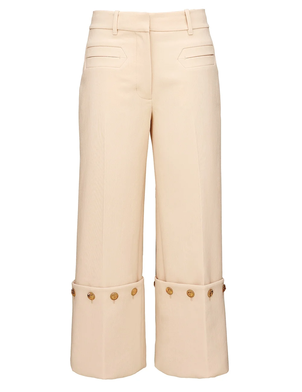 ITEM DETAILS The Rebellion Straight Crop Pant in Cream from our Cruise 2026 Collection, Twisted Romance. A tailored straight-leg pant featuring a mid-rise waistband, welt pockets and folded cuffs with gold button detailing. - Tailored straight-leg silhouette - Double hook-and-bar fastening at centre front - Welt pockets at front and back - Pintucks through centre front legs - Folded cuffs with gold button detail Style Code: 6287PC261 SIZE DETAILS Fitted at the waist and hips, relaxed through the legs Mid-rise waist with a cropped-length leg Heavy-weight, non-stretchy fabric This garment fits true to size Available in size 0P, suited to clients who are under 5'3"/ 160cm Model is 5'9.5"/178 cm, bust size 32C/10C and wears a size 0 CARE INSTRUCTIONS Main: 100% recycled polyester; lining: 100% cotton Dry clean only code f (hydrocarbon only); Remove any detachable trims prior to dry cleaning; Cover to protect trim; Iron in low temperature with protective cloth; Light steam only; Do not spot clean Always check the label or care card for specific care instructions.