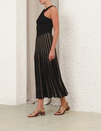 ITEM DETAILS The Rebellion Striped Halter Dress in Metallic Black/Gold from our Cruise 2026 Collection, Twisted Romance. A knit midi dress featuring a halter silhouette with wide criss-cross strap detail at the centre front. - Knit midi dress - Halter neckline - Wide criss-cross strap detail - Elongated V-style bodice - Scooped mid-low back - Slip on style Style Code: 2246DC261 SIZE DETAILS 0P 0 1 2 3 4 Bust 22 24.5 27 28.5 30.5 32.5 Waist 18 20.5 23 24.5 27 28.5 Close fit through the bust and waist When trying on this style, pull it on overhead This garment fits true to size Available in size 0P, suited to clients who are under 5'3"/ 160cm Model is 5'9.5"/178 cm, bust size 32C/10C and wears a size 0 Item measurements are in inches CARE INSTRUCTIONS 89% viscose 6% metallic 5% nylon Self yarn lining Remove any detachable trims prior to dry cleaning Cover to protect trim Iron in low temperature with protective cloth Do not spot clean Store garment flat do not hang Always check the label or care card for specific care instructions.