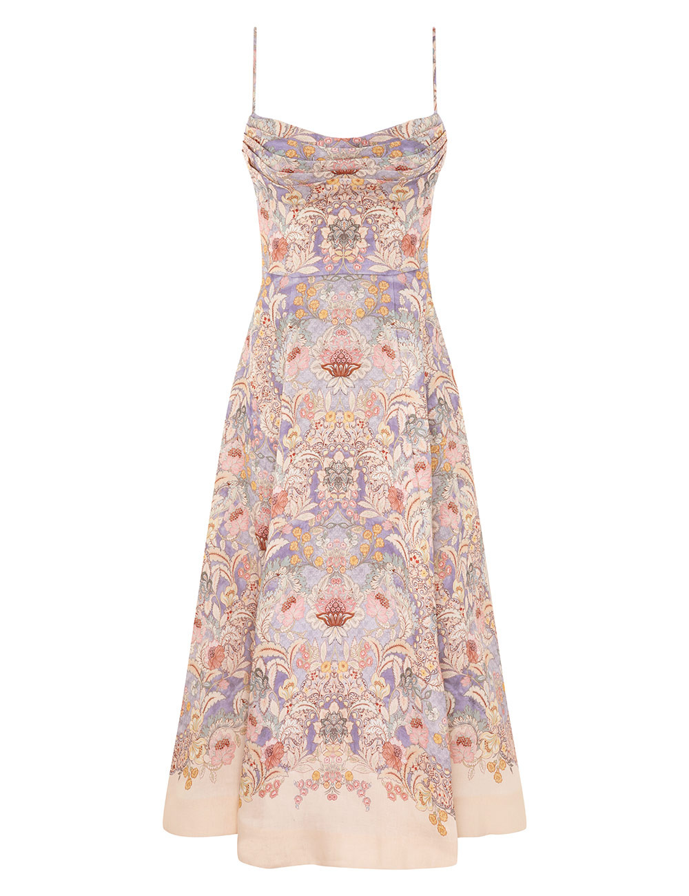ITEM DETAILS The Rebellion Tuck Midi Dress in Blue Floral from our Cruise 2026 Collection, Twisted Romance. A linen midi dress featuring drape detailing across the bust, adjustable straps, finished with a full flare skirt. - Linen fabric - Ruching at bust - Bust with internal boning - Shirred elastic across centre back - Invisible centre back zip closure - Lined Style Code: 6939DC261 SIZE DETAILS 0P 0 1 2 3 4 Length 33.5 36.5 36.5 36.5 36.5 36.5 Bust 32.5 34.5 36 38.5 40 42.5 Waist 24.5 26 27.5 30 31.5 34 Designed to be fitted at the bust and waist, loose at the hip Mid-weight, non-stretchy fabric This garment fits true to size Available in size 0P, suited to clients who are under 5'3"/ 160cm Model is 5'9.5"/178 cm, bust size 32C/10C and wears a size 0 Item measurements are in inches CARE INSTRUCTIONS Red main: 100% linen; fusing: 100% polyester; belt: 100% silk buf main: 100% linen; fusing: 100% polyester Dry clean only code f (hydrocarbon only); Remove any detachable trims prior to dry cleaning; Cover to protect trim; Iron in low temperature with protective cloth; Light steam only; Do not spot clean Always check the label or care card for specific care instructions.