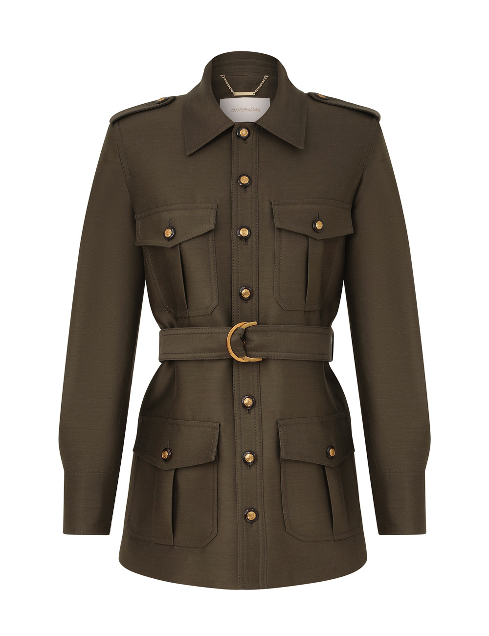 ITEM DETAILS The Rebellion Utility Jacket in Dark Olive from our Cruise 2026 Collection, Twisted Romance. A wool-silk blend jacket featuring a classic collar, gold buttons down the centre front and functional flap pockets. - Wool-silk blend fabric - Gold button detailing - Front pockets at chest and hips - Shoulder lapels - Self covered removable hardware belt - Buttoned cuffs - Fully lined Style Code: 7003JC261 SIZE DETAILS 0P 0 1 2 3 4 Length 27 31 29 29.5 30 30 Bust 36 38.5 40 42.5 44 46.5 Waist 37 38.5 41 42.5 45 46.5 Sleeve 22.5 24 24.5 24.5 25 25 Tailored fit Heavy-weight, non-stretchy fabric This garment fits true to size Available in size 0P, suited to clients who are under 5'3"/ 160cm Model is 5'9.5"/178 cm, bust size 32C/10C and wears a size 0 Item measurements are in inches CARE INSTRUCTIONS Main: 92% wool, 8% silk; lining: 75% viscose, 25% silk Dry clean only code f (hydrocarbon only); Remove any detachable trims prior to dry cleaning; Cover to protect trim; Iron in low temperature with protective cloth; Light steam only; Do not spot clean Always check the label or care card for specific care instructions.