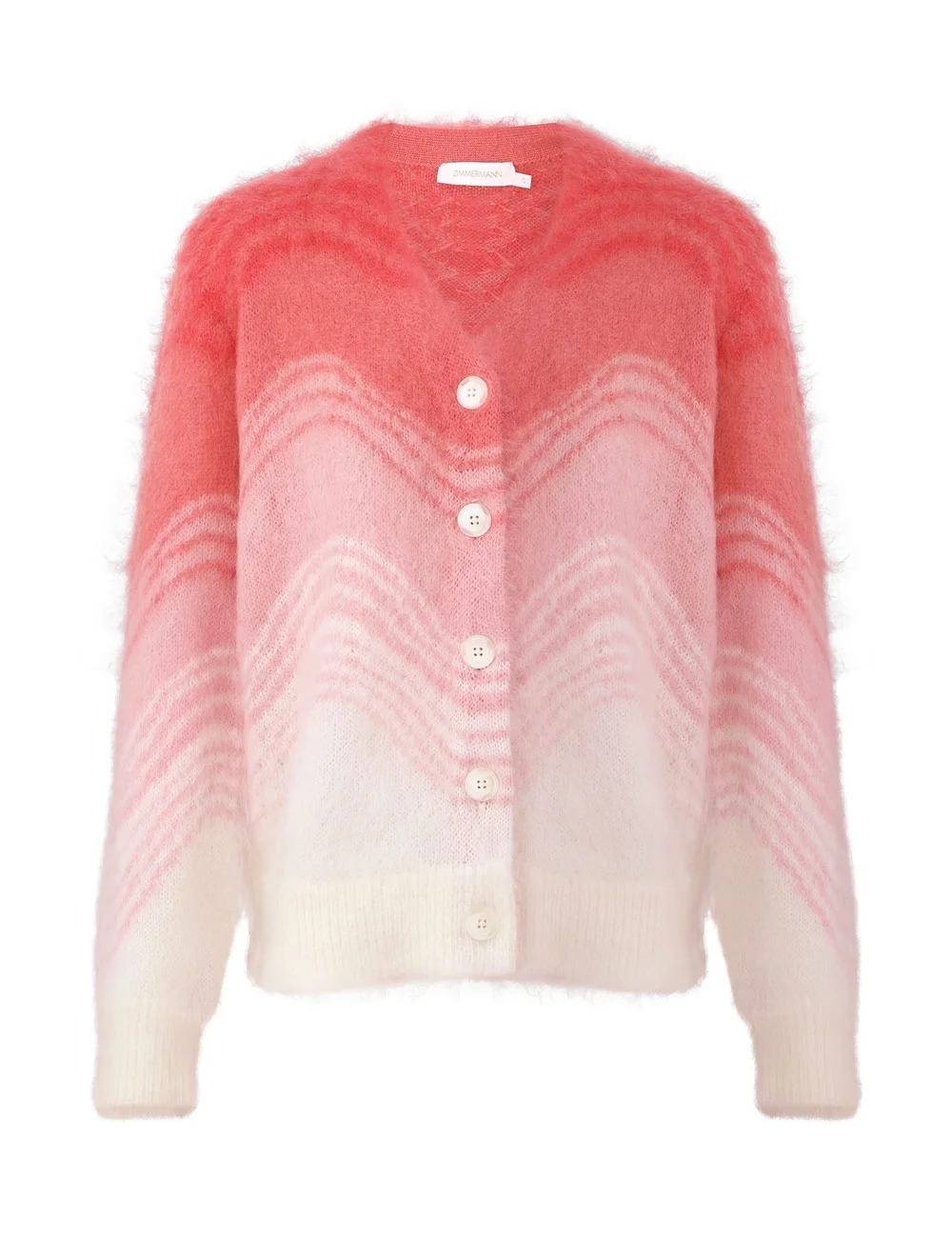 ITEM DETAILS The Rebellion Wave Cardigan in Pink Multi from our Cruise 2026 Collection, Twisted Romance. A mohair wool cardigan featuring a deep V-neckline, buttons down the centre front and a ribbed trim. - Wool blend cardigan - Oversized fit - Ribbed cuffs and hem - Functional wooden buttons down the centre front Style Code: 6673TC261 SIZE DETAILS 0P 0 1 2 3 4 Length 22 23.5 24 24.5 24.5 25 Sleeve 21 22.5 23 23 23 23.5 Designed for an oversized, loose fit This garment fits true to size Available in size 0P, suited to clients who are under 5'3"/ 160cm Model is 5'9.5"/178 cm, bust size 32C/10C and wears a size 0 Item measurements are in inches CARE INSTRUCTIONS 55% mohair wool 30% nylon 15% woo Dry clean only code f (hydrocarbon only) Remove any detachable trims prior to dry cleaning Cover to protect trim Iron in low temperature with protective cloth Do not spot clean Store garment flat do not hang Always check the label or care card for specific care instructions.