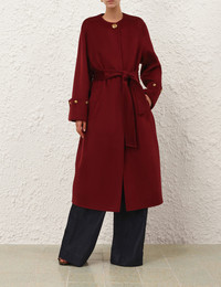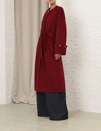 ITEM DETAILS The Rebellion Wrap Coat in Burgundy from our Cruise 2026 Collection, Twisted Romance. A wool blend coat featuring a crew neckline, gold button detailing, front flap pockets and a self-tie waist belt. - Wool blend fabric - Midi-length coat - Gold button closure at neckline - Removable soft waist belt - Folded cuffs with gold button detailing - Front welt pockets - Unlined Style Code: 6852CC261 SIZE DETAILS 0P 0 1 2 3 4 Length 42.5 47.5 48 48.5 48.5 49 Bust 42.5 44 46.5 48 50.5 53 Hip 42.5 45 46.5 49 50.5 53 Sleeve 21.5 23 23 23 23.5 23.5 Designed for a relaxed fit This garment fits true to size Available in size 0P, suited to clients who are under 5'3"/ 160cm Model is 5'9.5"/178 cm, bust size 32C/10C and wears a size 0 Item measurements are in inches CARE INSTRUCTIONS Main: 58% wool, 16% polyamide, 14% viscose, 12% silk Dry clean only code f (hydrocarbon only); Remove any detachable trims prior to dry cleaning; Cover to protect trim; Iron in low temperature with protective cloth; Light steam only; Do not spot clean Always check the label or care card for specific care instructions.