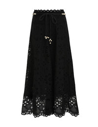 ITEM DETAILS The Rhiannon Embroidered Skirt in Black from our Summer Swim 2025 Collection. A cotton midi skirt featuring scalloped detailing, a removable belt and an invisible zip closure. - 100% cotton fabric - Scallop trim on waistband and hem - Removable wood beaded tie belt - Invisible centre back zip closure with hook and eye Style Code: 4248SSS251 SIZE DETAILS 0P 0 1 2 3 4 Length 28.5 32 32 32 32 32 Waist 24.5 26 28.5 30 32.5 34 Designed to be fitted across the waist, relaxed through the legs This garment fits true to size Available in size 0P, suited to clients who are under 5'3"/ 160cm Model is 5'9.5"/178 cm, bust size 32C/10C and wears a size 0 Item measurements are in inches CARE INSTRUCTIONS Main: 100% cotton; embroidery: 100% polyester; lining: 100% cotton Dry clean only code f (hydrocarbon only); Remove any detachable trims prior to dry cleaning; Cover to protect trim; Cool iron with protective cloth; Light steam only; Do not spot clean Always check the label or care card for specific care instructions.