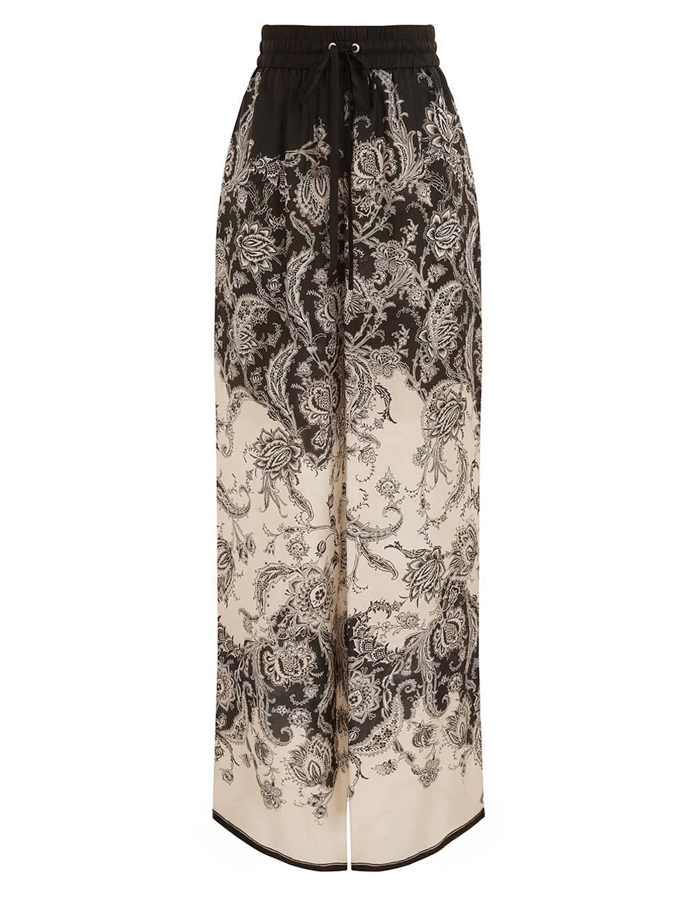 ITEM DETAILS The Rhiannon Relaxed Pant in Cream/Black Floral from our Summer Swim 2025 Collection. A silk habutae mid rise pant featuring a relaxed silhouette, bold placement print and a drawstring waist. - 100% silk fabric - Wide leg pant - Functional side pockets - Self tie waist Style Code: 3254PSS251 SIZE DETAILS 0P 0 1 2 3 4 Length 36.5 41.5 41.5 41.5 41.5 42 Waist 25 26 28.5 30.5 32.5 34.5 Hip 40 41.5 44 45.5 48 49.5 Inseam 26 29.5 29.5 29.5 29.5 29.5 Designed to be worn relaxed, with an elasticated waistband for a flexible fit This garment fits true to size Available in size 0P, suited to clients who are under 5'3"/ 160cm Model is 5'9.5"/178 cm, bust size 32C/10C and wears a size 0 Item measurements are in inches CARE INSTRUCTIONS Main: 100% silk Dry clean only code f (hydrocarbon only); Remove any detachable trims prior to dry cleaning; Cover to protect trim; Cool iron with protective cloth; Light steam only; Do not spot clean Always check the label or care card for specific care instructions.