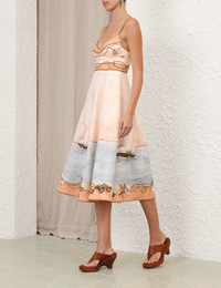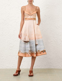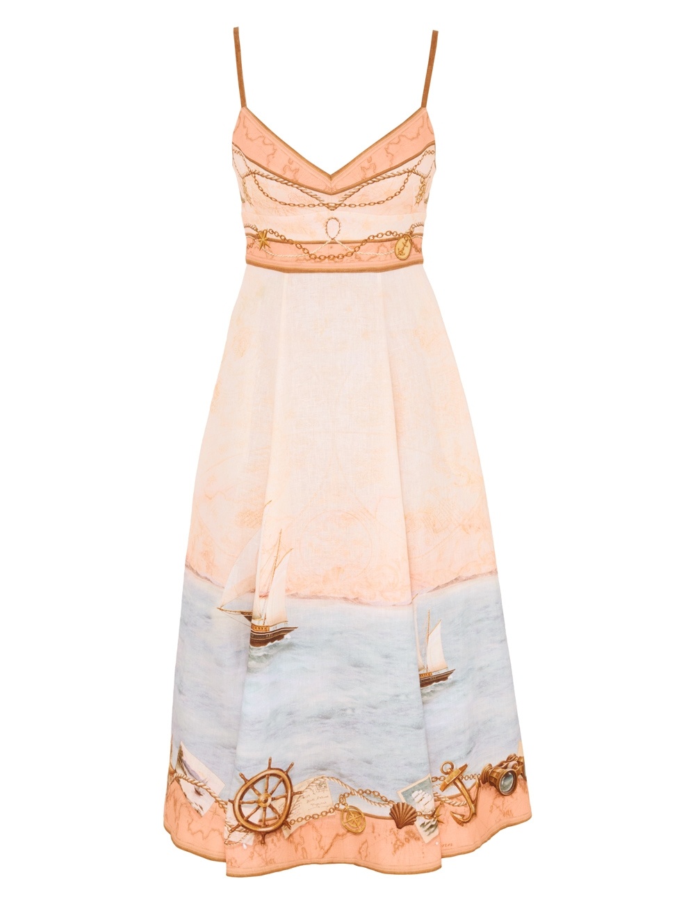 ITEM DETAILS The Scarborough Picnic Midi Dress in Peach Nautical Map from our Summer Swim 2025 Collection. A linen midi dress featuring a V-neckline, shirred back, adjustable straps and a full flared skirt. - 100% linen fabric - Contrasting piping and hem - Adjustable straps for flexible fit - Gathered bodice with fitted waistband - Shirred elastic across centre back - Invisible zip closure with hook and eye at centre back - Side seam pockets Summer Swim Exclusives: Only available at zimmermann.com and in select boutiques. Style Code: 4255DSS256 SIZE DETAILS 0P 0 1 2 3 Length 33 36.5 36.5 36.5 36.5 Bust 27 29 31.5 33 35.5 Waist 23.5 25 27.5 29 31.5 Hip 41 43.5 45.5 47 49.5 Designed to be fitted at the bust and waist, loose at the hip This garment fits true to size Available in size 0P, suited to clients who are under 5'3"/ 160cm Model is 5'9.5"/178 cm, bust size 32C/10C and wears a size 0 Item measurements are in inches CARE INSTRUCTIONS Main: 100% linen, bodice lining: 100% linen, skirt lining: 100% cotton Dry clean only code f (hydrocarbon only); Remove any detachable trims prior to dry cleaning; Cover to protect trim; Cool iron with protective cloth; Light steam only; Do not spot clean Always check the label or care card for specific care instructions.