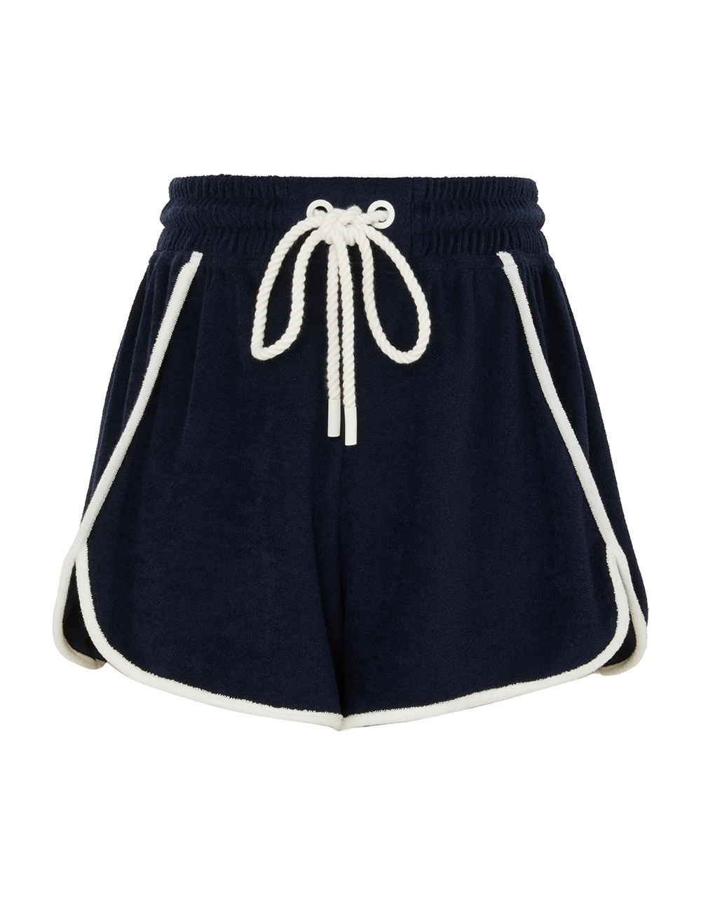 ITEM DETAILS The Scarborough Towel Short in Navy/Ivory from our Summer Swim 2025 Collection. A terry towelling short featuring a drawstring waistband with toggle ends and functional back pocket. - Towelling short with elasticated waistband - ZIMMERMANN patch on back left pocket - Contrast piping along edges Summer Swim Exclusives: Only available at zimmermann.com and in select boutiques. Style Code: 4440ASS256 SIZE DETAILS 0P 0 1 2 3 Length 7.5 8.5 8.5 9 9 Waist 24.5 25 27.5 30 31.5 Hip 43.5 45.5 47 49.5 51 Inseam 3 3 3 3 3 Designed with an elasticated waistband for a flexible fit This garment fits true to size Available in size 0P, suited to clients who are under 5'3"/ 160cm Model is 5'9.5"/178 cm, bust size 32C/10C and wears a size 0 Item measurements are in inches CARE INSTRUCTIONS Main: 79% cotton, 21% polyester Gentle cold hand wash separately with mild detergent; Remove any detachable trims prior to cleaning; Cover to protect trim; Do not soak, rub or wring; Do not bleach; Dry in shade; Cool iron with protective cloth; Do not tumble dry; Do not spot clean; Dry cleanable code f (hydrocarbon only); Always check the label or care card for specific care instructions.