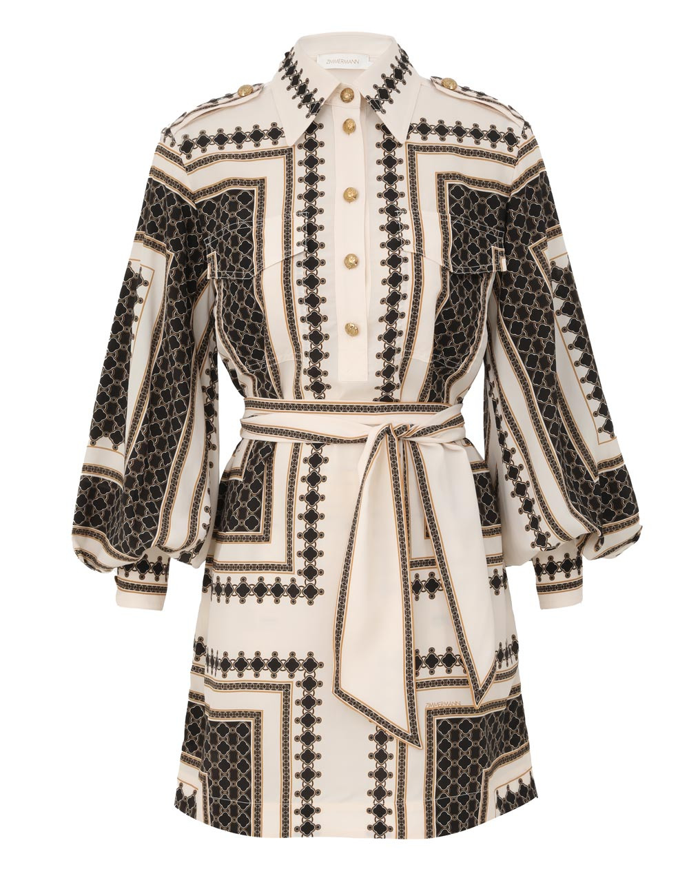 ITEM DETAILS The Scarf Mini Dress in Black Geo Print from our Fall 2025 Collection, Hypnotic. A long sleeve mini dress featuring a classic collar, buttons down the centre front and a removable waist belt. - Classic collar - Long blouson sleeves with fitted cuffs - Gold buttons down centre front placket and on shoulder tabs - Removable self-tie belt - Front chest flap pockets - Side splits on skirt Style Code: 5438DF25R SIZE DETAILS 0P 0 1 2 3 4 Length 80 86 87 88 90 92 Bust 96 100 106 112 118 122 Sleeve 66 70 71 72 72 73 Designed for a relaxed fit This garment fits true to size Available in size 0P, suited to clients who are under 5'3"/ 160cm Model is 5'9.5"/178 cm, bust size 32C/10C and wears a size 0 Item measurements have been rounded to the nearest cm CARE INSTRUCTIONS Main: 55% viscose, 45% silk Dry clean only code f (hydrocarbon only); Remove any detachable trims prior to dry cleaning; Cover to protect trim; Do not steam; Cool iron with protective cloth; Do not spot clean Always check the label or care card for specific care instructions.