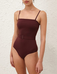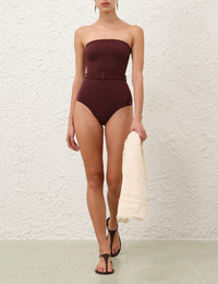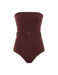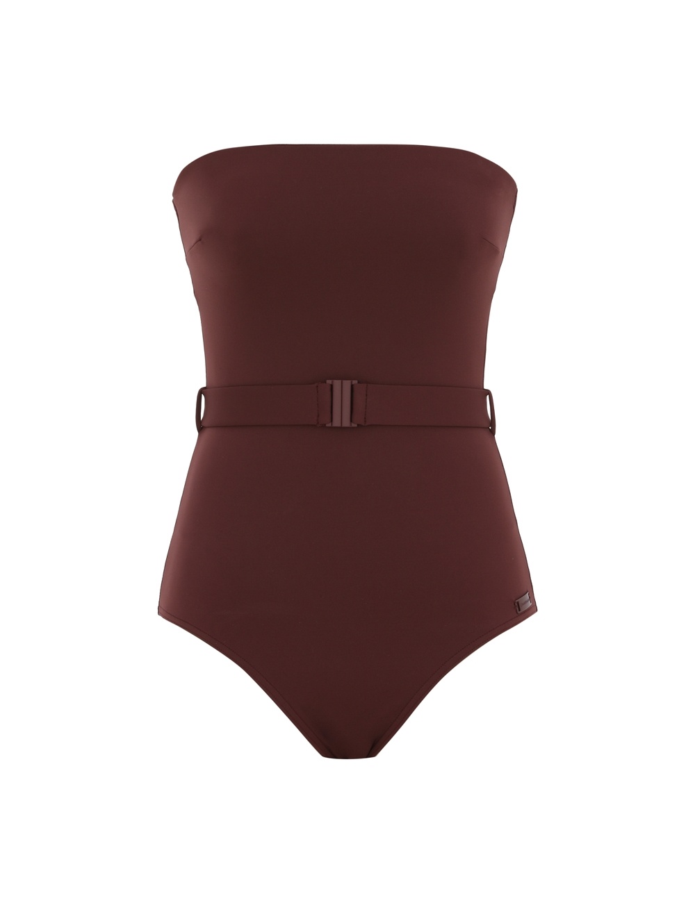ITEM DETAILS The Separates Bandeau 1PC in Chocolate from our Summer Swim 2025 Collection. A lycra bandeau one piece featuring a shelf bra, boning in the side seams and removable chain trim belt. - Lycra bandeau one piece - Removable and adjustable straps - Rouleau loops with removable waist belt - Midi cut legline - Medium coverage bottom Style Code: 1380WSS25 SIZE DETAILS This garment fits true to size Model is 5'10.5"/179 cm, bust size 34C/12C and wears a size 0 CARE INSTRUCTIONS Main: 62% polyamide, 38% elastane; lining: 92% recycled nylon, 8% spandex Do not roll up when wet; Rinse thoroughly after use; Remove any detachable trims prior to washing; Cold hand wash separately with mild detergent, avoid fabric softener; Dry in shade; Do not bleach or iron; Do not tumble dry; Do not dry clean; Light colours may be transparent when wet; Avoid contact with sunscreens, oils and rough surfaces; Avoid high temperature pools and spas treated with harsh chemicals Always check the label or care card for specific care instructions.