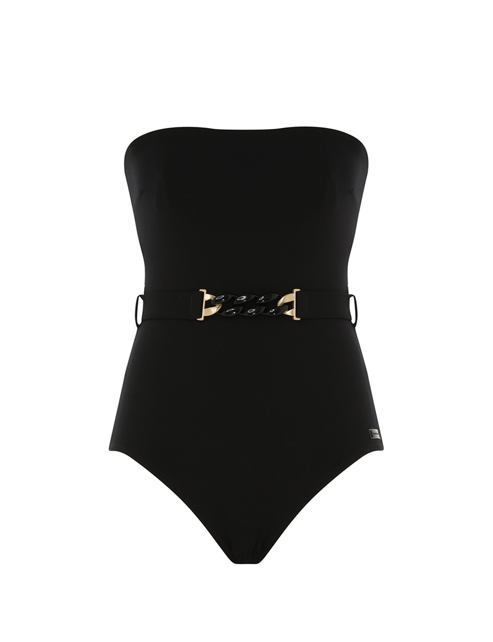 ITEM DETAILS The Separates Chain Bandeau 1PC in Black from our Summer Swim 2025 Collection. A lycra bandeau one piece featuring a shelf bra, boning in the side seams and removable chain trim belt. - Lycra bandeau one piece - Removable and adjustable straps - Rouleau loops with removable waist belt - Midi cut legline - Medium coverage bottom Style Code: 1380WSS25A SIZE DETAILS This garment fits true to size Model is 5'10.5"/179 cm, bust size 34C/12C and wears a size 0 CARE INSTRUCTIONS Main: 62% polyamide, 38% elastane; lining: 92% recycled nylon, 8% spandex Do not roll up when wet; Rinse thoroughly after use; Remove any detachable trims prior to washing; Cold hand wash separately with mild detergent, avoid fabric softener; Dry in shade; Do not bleach or iron; Do not tumble dry; Do not dry clean; Light colours may be transparent when wet; Avoid contact with sunscreens, oils and rough surfaces; Avoid high temperature pools and spas treated with harsh chemicals Always check the label or care card for specific care instructions.