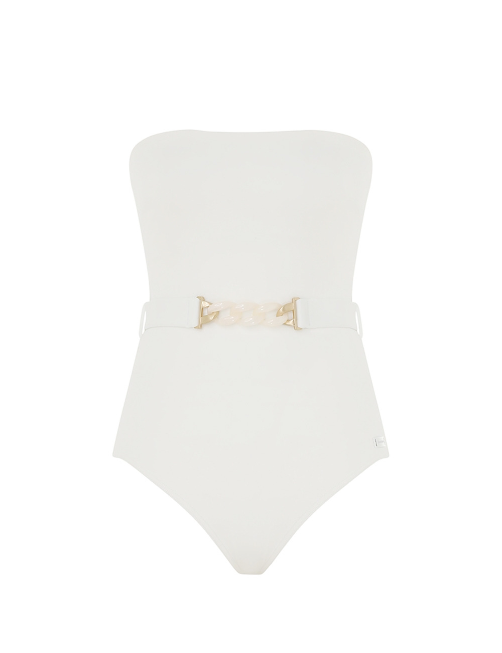 ITEM DETAILS The Separates Chain Bandeau 1PC in Ivory from our Summer Swim 2025 Collection. A lycra bandeau one piece featuring a shelf bra, boning in the side seams and removable chain trim belt. - Lycra bandeau one piece - Removable and adjustable straps - Rouleau loops with removable waist belt - Midi cut legline - Medium coverage bottom Style Code: 1380WSS25A SIZE DETAILS This garment fits true to size Model is 5'10.5"/179 cm, bust size 34C/12C and wears a size 0 CARE INSTRUCTIONS Main: 62% polyamide, 38% elastane; lining: 92% recycled nylon, 8% spandex Do not roll up when wet; Rinse thoroughly after use; Remove any detachable trims prior to washing; Cold hand wash separately with mild detergent, avoid fabric softener; Dry in shade; Do not bleach or iron; Do not tumble dry; Do not dry clean; Light colours may be transparent when wet; Avoid contact with sunscreens, oils and rough surfaces; Avoid high temperature pools and spas treated with harsh chemicals Always check the label or care card for specific care instructions.