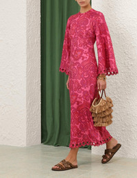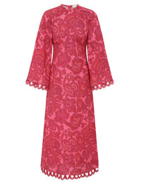 ITEM DETAILS The Stardust Long Sleeve Midi in Pink Paisley from our Resort Swim 2026 Collection. A linen midi dress featuring a crew neckline and long raglan sleeves with wide cuffs, finished with an invisible centre back zip closure and scalloped trim on the cuffs and hem. - 100% linen fabric - Crew neckline with beaded trim - Long wide sleeves - Scalloped trim at sleeve cuffs and hem - Lined Style Code: 6197DRS265 SIZE DETAILS 0P 0 1 2 3 4 Length 46 51 51 51 51 51.5 Bust 32.5 34 36 38 40 41.5 Waist 27.5 29 30.5 33 34.5 37 Hip 36 38.5 40 42.5 44 46.5 Sleeve 25 26.5 27 27 27 27 Fitted at the bust and waist, relaxed through the hips and legs This garment fits true to size Available in size 0P, suited to clients who are under 5'3"/ 160cm Model is 5'9.5"/178 cm, bust size 32C/10C and wears a size 0 Item measurements are in inches CARE INSTRUCTIONS Main: 100% linen Dry clean only code f (hydrocarbon only); Remove any detachable trims prior to dry cleaning; Cover to protect trim; Iron in low temperature with protective cloth; Light steam only; Do not spot clean Always check the label or care card for specific care instructions.