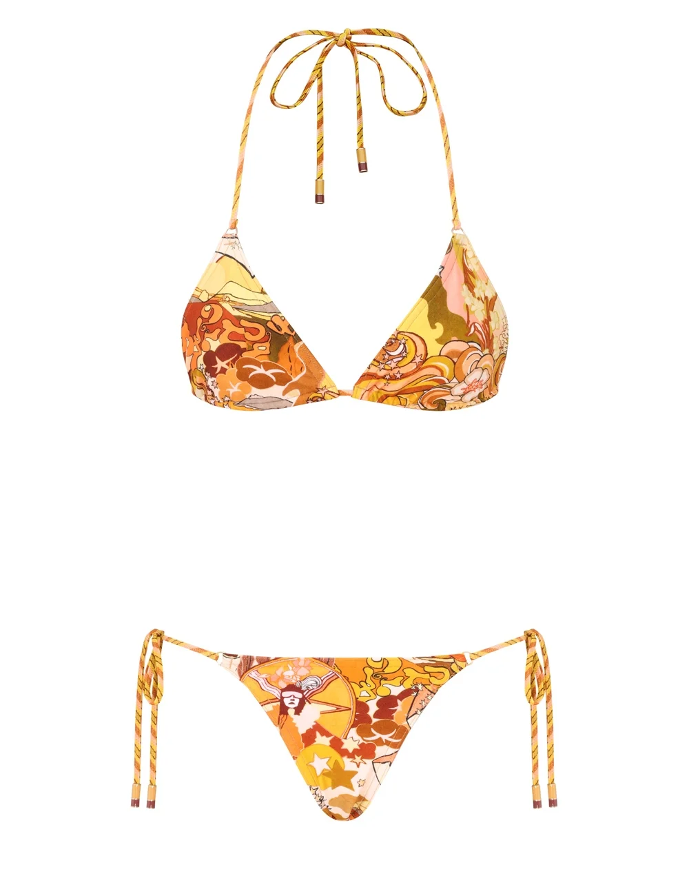 ITEM DETAILS The Stardust Mini Tri Bikini in Mustard Stardust from our Resort Swim 2026 Collection. A bikini set featuring a triangle top and low cut pant with self-tie straps. - Bikini set with shiny finish - Triangle bra top with removable cups - Self-tie straps with toggle ends - Medium coverage - Lined Style Code: 0106WRS265 SIZE DETAILS This garment fits true to size Model is 5'10.5"/179 cm, bust size 34C/12C and wears a size 0 CARE INSTRUCTIONS Main: 80% polyamide, 20% elastane; lining: 92% recycled nylon, 8% elastane Do not roll up when wet; Rinse immediately after use; Remove any detachable trims prior to washing; Cold hand wash separately with mild detergent, avoid fabric softener; Dry in shade; Do not bleach or iron; Do not tumble dry; Do not dry clean; Light colours may be transparent when wet; Avoid contact with sunscreens, oils, rough surfaces, and high temperature pools and spas; Always check the label or care card for specific care instructions.
