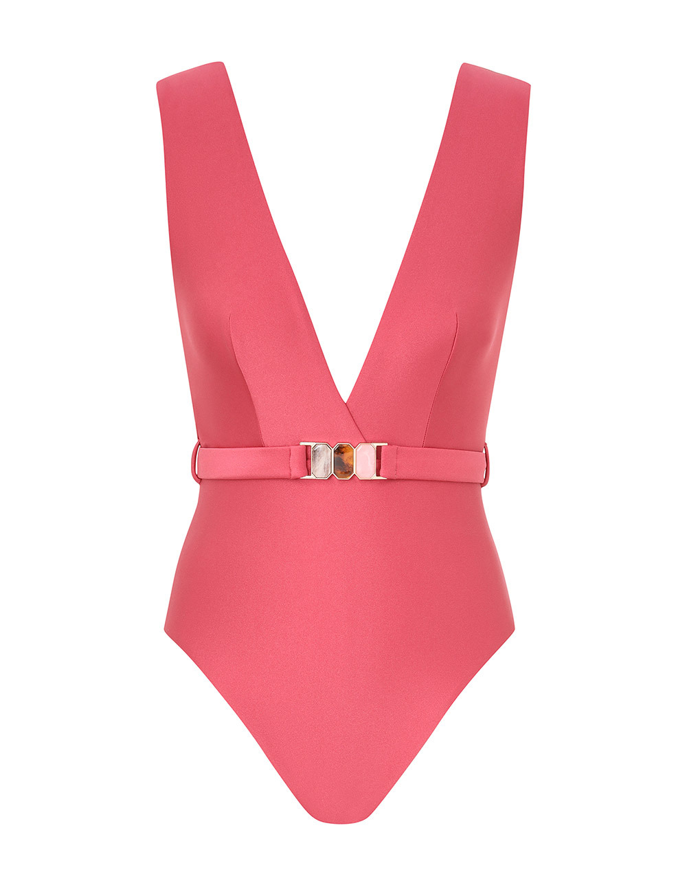 ITEM DETAILS The Wanderlust Belted Plunge 1PC in Deep Rose from our Resort Swim 2026 Collection. A shiny lycra plunging V-neck one piece featuring fixed wide strap and full bottom coverage. - Italian lycra with shiny finish - Exposed back - Removable belt with signature back clasp closure - Maximum bottom coverage - Lined Style Code: 7056WRS262 SIZE DETAILS This garment fits true to size Model is 5'10.5"/179 cm, bust size 34C/12C and wears a size 0 CARE INSTRUCTIONS Main: 80% polyamide, 20% elastane; lining: 92% recycled nylon, 8% elastane Do not roll up when wet; Rinse immediately after use; Remove any detachable trims prior to washing; Cold hand wash separately with mild detergent, avoid fabric softener; Dry in shade; Do not bleach or iron; Do not tumble dry; Do not dry clean; Light colours may be transparent when wet; Avoid contact with sunscreens, oils, rough surfaces, and high temperature pools and spas; Always check the label or care card for specific care instructions.