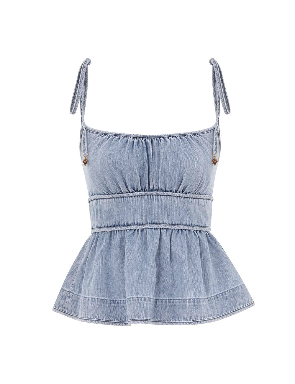 ITEM DETAILS The Wanderlust Denim Cami in Skylark from our Resort Swim 2026 Collection. A denim cami featuring a square neckline, self-tie straps, finished with a centre back zip closure and peplum flare waist detailing. - Denim top - Bow tie straps with beaded trim - Ruched bust - Fixed waistband with peplum - Shirred back bodice - Gold metal centre back zip closure - Heavily gathered Style Code: 5467TRS262 SIZE DETAILS 0P 0 1 2 3 4 Length 6 6.5 6.5 6.5 6.5 6.5 Bust 29 30.5 33 35.5 37 39.5 Waist 24.5 25 27.5 29 31.5 33 Designed to be fitted at the bust and waist This garment fits true to size Available in size 0P, suited to clients who are under 5'3"/ 160cm Model is 5'9.5"/178 cm, bust size 32C/10C and wears a size 0 Item measurements are in inches CARE INSTRUCTIONS Main: 100% cotton; bodice lining: 100% cotton Gentle cold hand wash separately with mild detergent Remove any detachable trims prior to washing Do not soak, rub or wring Do not bleach Do not tumble dry Dry in shade; Iron in low temperature with protective cloth Do not spot clean; Do not dry clean Always check the label or care card for specific care instructions.