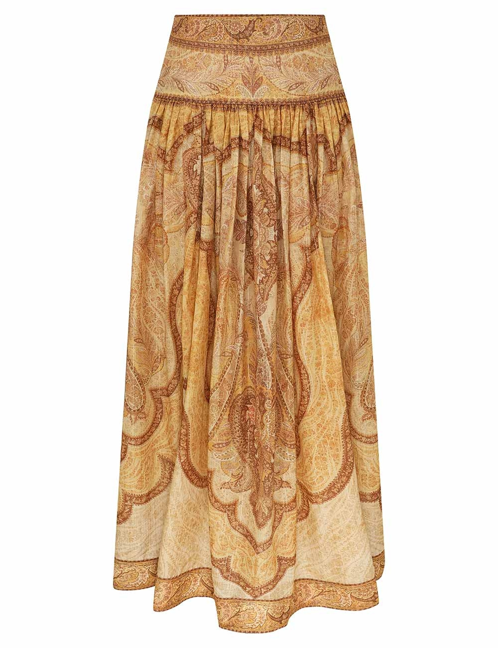ITEM DETAILS The Wanderlust Maxi Skirt in Tapestry Mustard Multi from our Resort Swim 2026 Collection. A cotton-silk blend maxi skirt featuring a fitted waistband, centre back invisible zip closure and gathered pleats throughout. - Mid-rise, full-length skirt - Fixed waistband - Invisible centre back zip closure - Functional side pockets - Placement embroidery - Lined Style Code: 6437SRS262 SIZE DETAILS 0P 0 1 2 3 4 Length 37 40.5 40.5 40.5 40.5 40.5 Waist 25 26 28.5 30 32.5 34 Designed to be fitted at the waist, relaxed through the legs This garment fits true to size Available in size 0P, suited to clients who are under 5'3"/ 160cm Model is 5'9.5"/178 cm, bust size 32C/10C and wears a size 0 Item measurements are in inches CARE INSTRUCTIONS Main: 72% cotton, 25% silk, 3% metallised fibre; pocketing: 100% cotton Dry clean only code f (hydrocarbon only); Remove any detachable trims prior to dry cleaning; Cover to protect trim; Iron in low temperature with protective cloth; Light steam only; Do not spot clean Always check the label or care card for specific care instructions.