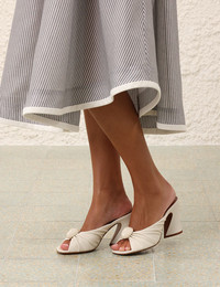 ITEM DETAILS The Zimmermann Gleam Mule 85 in Almond from our Fall 2024 Collection, In Illustration. A leather mule featuring heavy gathering at the front shoe with a statement pebble hardware design. - Leather mule - Made in Italy - Square toe - Pebble detail at front shoe - 85mm block heel Style Code: 0953FF24 SIZE DETAILS This shoe fits true to size. CARE INSTRUCTIONS Main: 100% leather Leather care: This item was handcrafted using genuine leather. Leather can alter or stain if in contact with humidity or atmospheric agents. Marks or irregularities in natural hides can appear in even the most luxurious skins. These are naturally occurring features and should not be thought of as imperfections. On occasion leather can stain clothing or other objects it comes into contact with. To maintain in best condition, avoid direct exposure to light, heat, water, oils, perfume and cosmetics. Store at room temperature in original dust bag. Always check the care card for specific care instructions.