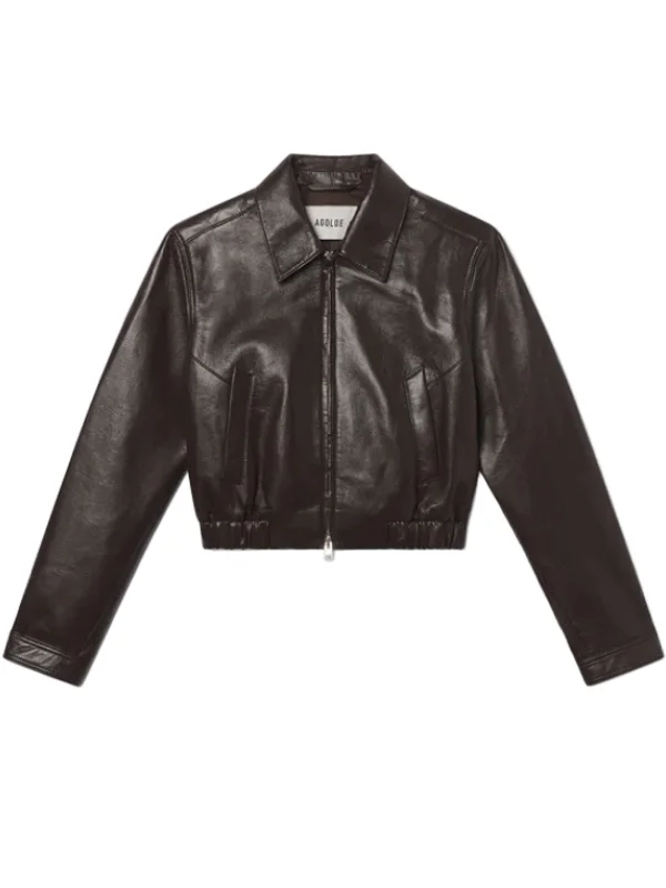 The Essie Jacket from Agolde is a modern, cropped silhouette crafted from buttery recycled leather. Finished in a deep, dark chocolate brown, it features clean lines, subtle shaping, and a gathered hem for a softly structured look. This fit is true to size. Product Details Designer ID: A5072-1285 Color: Chocolate Composition: 50% Recycled Leather, 30% Polyurethane, 10% Viscose, 10% Polyester Imported