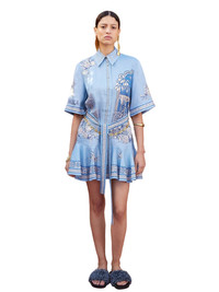 The Villa Romantica dress by Alemais is a mini silhouette with a pointed collar. This dress also features embroidered motif detail with raffia buttons and in-seam pockets. Product Details: Designer ID: 6092D Color: Blue Composition: 56% Linen 44% Viscose Imported