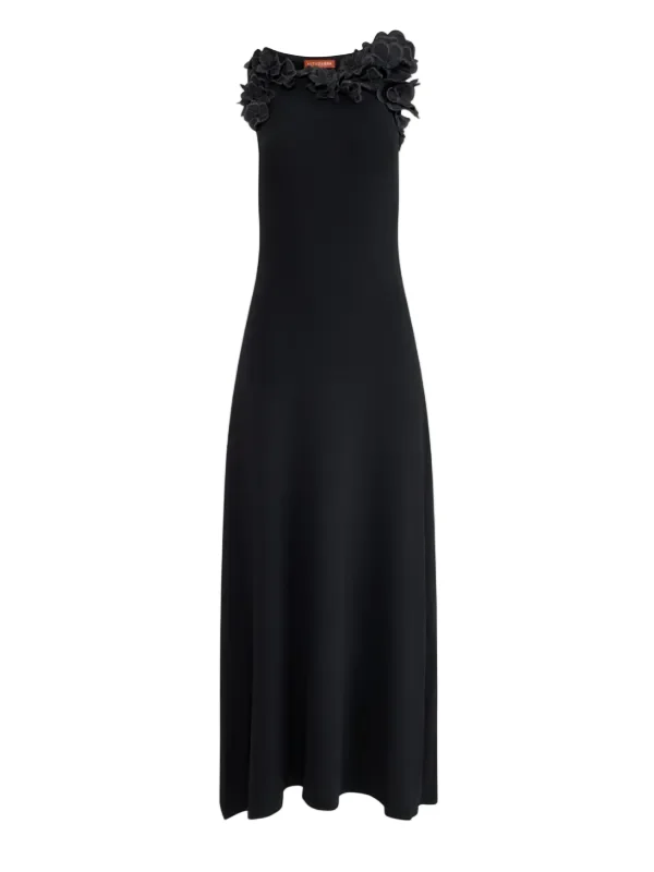 Altuzarra's Woolfe dress features a sleek, elongated silhouette with floral appliques detailing along the neckline. Designed to fall fluidly to a full-length hem, it offers an elegant, sculpted look with subtle texture and dimension. Product Details Designer ID: S226-8322 Color: Black Composition: 85% Dull Viscose, 15% Polyester Imported