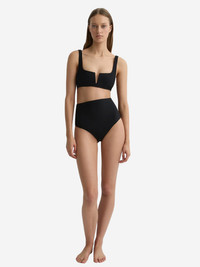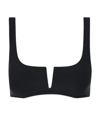 The Clio bikini top by Bondi Born features a square neckline with a V wire at centre front, featuring wide shoulder straps and invisible under-bust support making it ideal for larger busts. Product Details: Designer ID: SI_B0045_BLK Color: Black Composition: 59% PA, 41% Lycra Imported