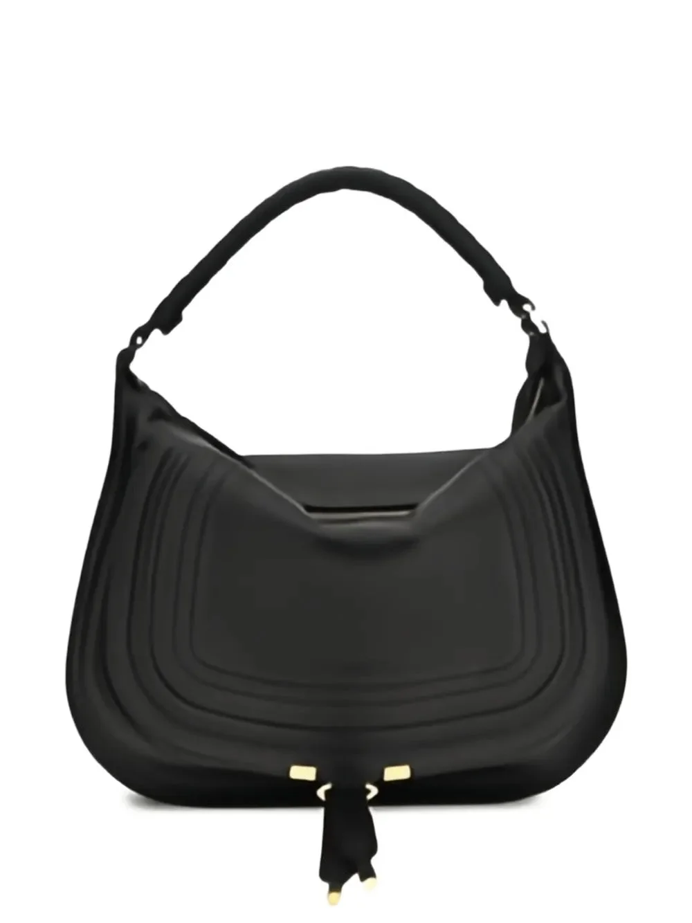 Crafted from smooth calfskin, this Marcie shoulder bag reinterprets Chloe's iconic day bag with a slouchier silhouette. Saddle stitching, a single hand-wrapped handle and gold-tone hardware finish the updated design. The line's dangling leather tassels secure the flap. Carry this leather bag in the hand or on the shoulder. Product Details Designer ID: CH26SS881R35001 Color: Black Composition: Main material: Calfskin; Secondary material: Calfskin; Main lining: 68% Linen, 32% Cotton Width: 14.6" (37 cm); Height: 9.8" (25 cm); Depth: 3.7" (9.5 cm); Handle drop: 8.7" (22 cm) Made in Italy