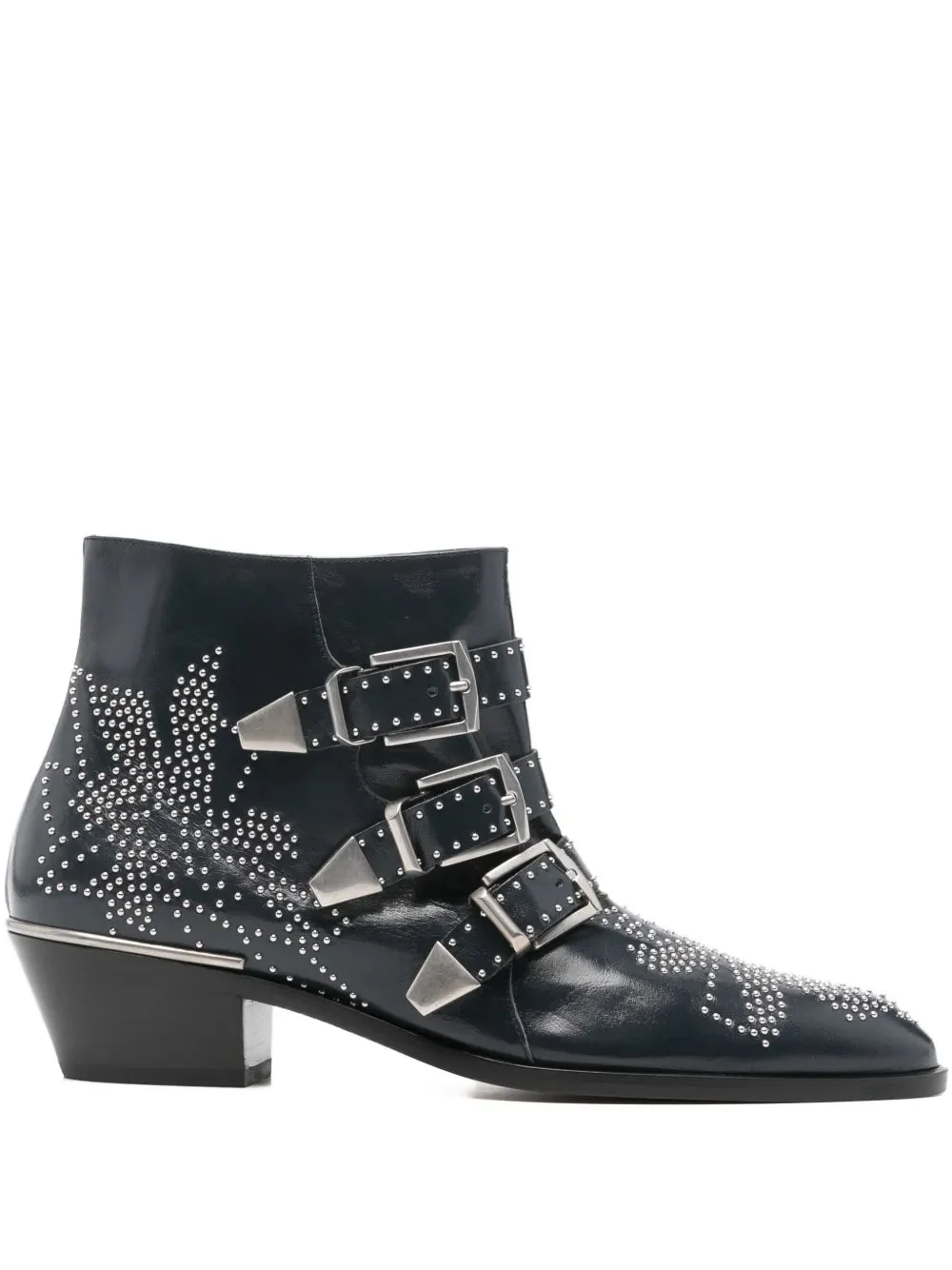 The statement Susanna Short Boot perfectly captures the Chloe girl's rock 'n' roll attitude. The glossy finish of the smooth and supple nappa sheepskin adds femininity, complementing the glamour of the vintage buckles and the emblematic studs. The elongated toe shape, Cuban heel and thick sole take inspiration from a cowboy design to create a striking heeled boot. Product Details Designer ID: CH26S134WF43Y Color: Deep Navy Composition: Upper: nappa sheepskin; Heel: stacked calf; Sole: calfskin; Lining: calfskin Short boot heel height: 1.6" (4 cm); Heel-to-toe drop: 1.2" (3 cm) Made in Italy