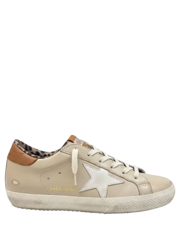 Women’s Super-Star sneakers are a Golden Goose evergreen and accompany its collections season after season, thanks to the use of innovative materials and finishes. This design, in beige cow leather, features a brown leather heel tab, platinum GGDB star and leopard print lining. Product Details Designer ID: GWF01003.F008121.15871.F1 Color: Beige/Platinum/Brown Composition: Leather, Rubber Made in Italy