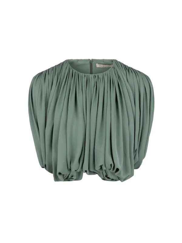 Heirlome's Renata is a shirred, draped top crafted in silk double georgette. The fabric is expertly draped in a single piece from front to back around the armhole, creating a seamless flow. Additional details include a classic crew neckline and structured shoulder pads, while the entire piece is fully lined in silk for a premium finish. Wear it with Perla Skirt in Eucalyptus. Product Details Designer ID: HLXI05130 Color: Eucalyptus Composition: 100% Silk Imported