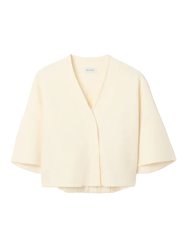 House of Dagmar's Short Wool Cardigan is a v-neck cardigan in a rich and rigid 100% merino wool. A Dagmar essential presented with a cropped frame, rounded dropped shoulders and concealed buttons at the front. Product Details Designer ID: 261F503 Color: Off White Composition: 100% Merino Wool Imported