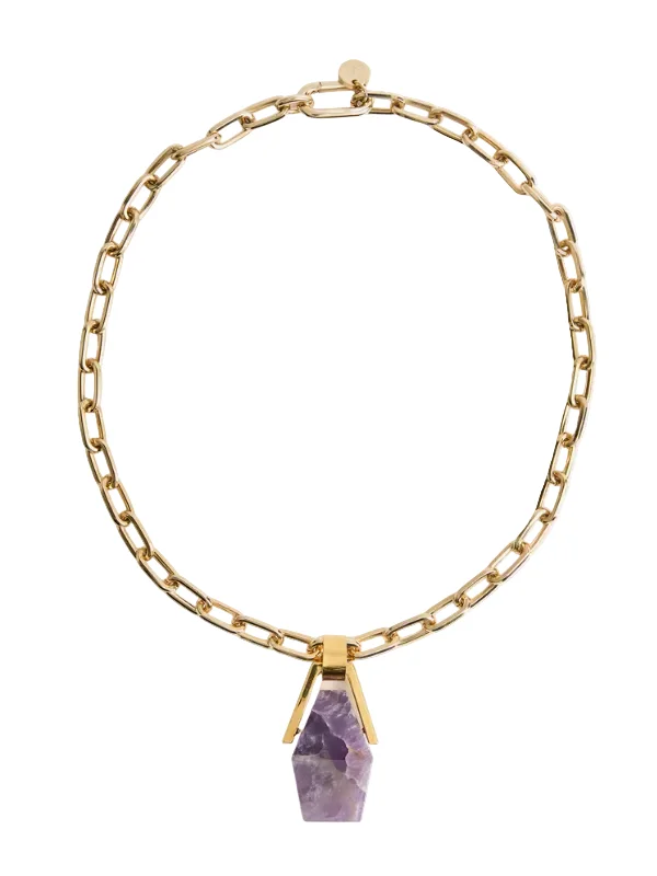 La DoubleJ's Portal Necklace is delivered in precious Amethyst - a powerful stone associated with the Crown Chakra that aids in cultivating a connection with the Divine. Layer it up with necklaces from your own collection or leave it solo for more of a statement. 24K Gold Plated Brass and Amethyst. **COMING SOON** Product Details Designer ID: NEC0021 Color: Amethyst Composition: 70% Brass 30% Amethyst Made in Italy