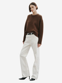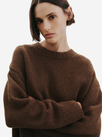 Nili Lotan's Haisley is an oversized medium to chunky weight crewneck pullover sweater in Italian lambswool. Boxy body. Regular length. Dropped shoulder. Rib trim at neck, sleeve and hem. Fashioning detail at arm hole and shoulder. Signature center back cable knit detail. Product Details Designer ID: 81210 Y182 Color: Cocoa Composition: 100% Lambswool Imported