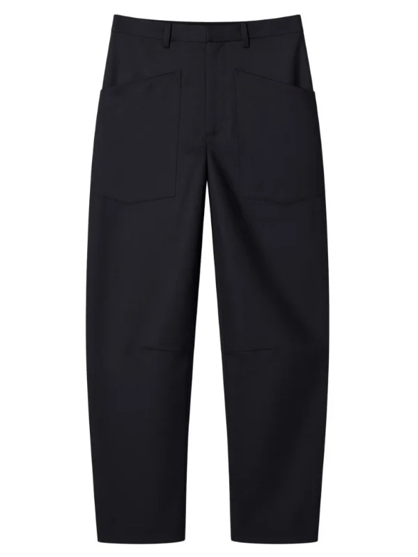 Nili Lotan's Shon is a mid-rise, relaxed fit barrel leg pant. Uniquely curved silhouette. Seam detail at knees. Gusset at inseam. Zip fly. Hidden hook-and-bar closure. Hidden stay button closure. Top-stitched front and back patch pockets. Belt loops. Designed for a 27" inseam. Product Details Designer ID: 13454W243 Color: Black Composition: 100% Virgin Wool Made in USA