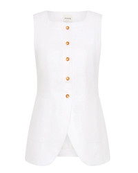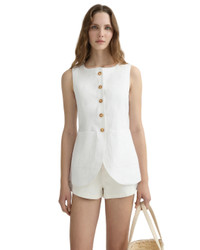 The Emma vest by POSSE features a refined high neckline, scooped hem and mottled buttons through the center front, with an adjustable back buckle and slit detail to create perfect the fit. Product Details: Designer ID: PS1382-IVO Color: Ivory Composition: 100% Linen Imported