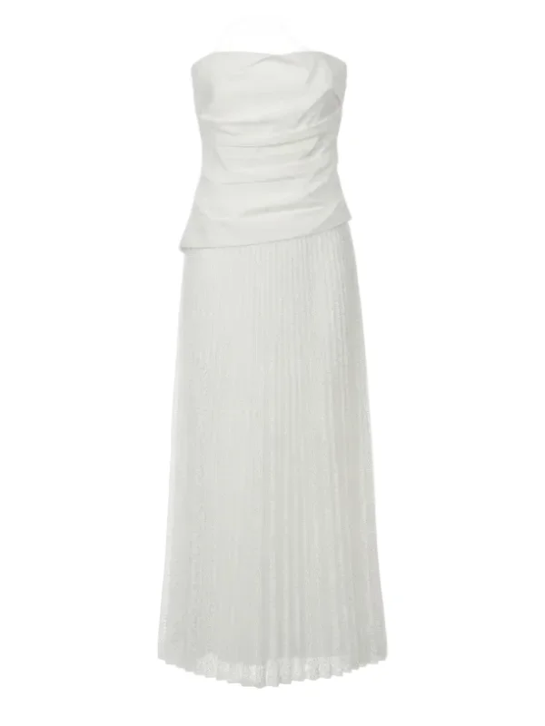 The Annalise Dress by Simkhai features a strapless ruched bodice in poplin and a pleated lace skirt. Product Details Designer ID: 226-1252-PK Color: White Composition: Shell: 100% Polyester; Lining: 100% Cotton Imported
