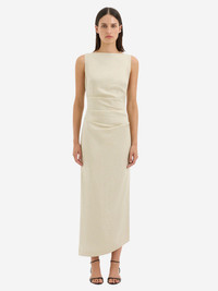 The Raquel Midi Dress by SIR. is crafted from their signature mid weight natural linen with a soft hand-feel. It features a statement open back with a cross over detail, soft tucks at the waist and an asymmetric hem. Product Details: Designer ID: SIR425-1025 Color: Wheat Composition: 100% Linen Imported